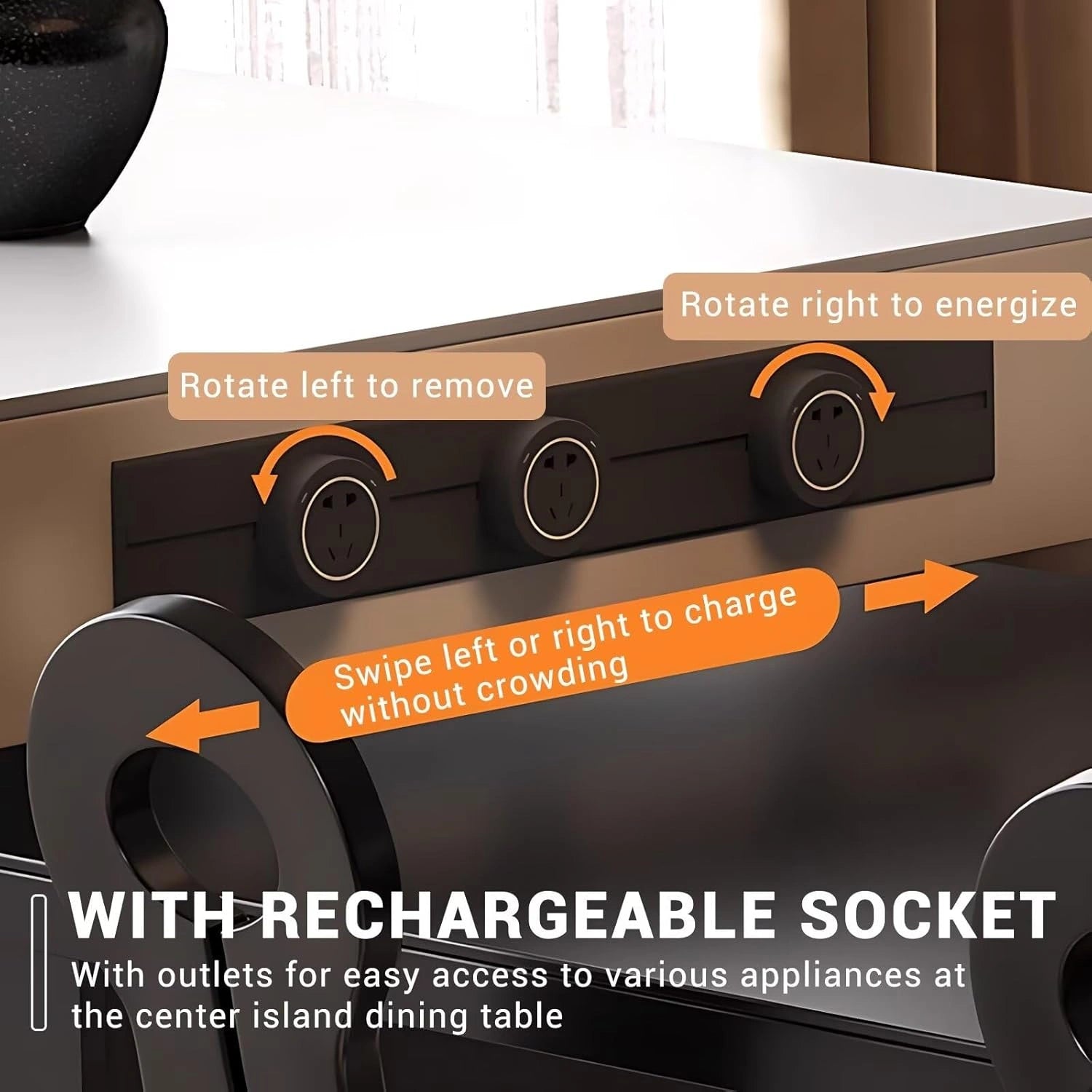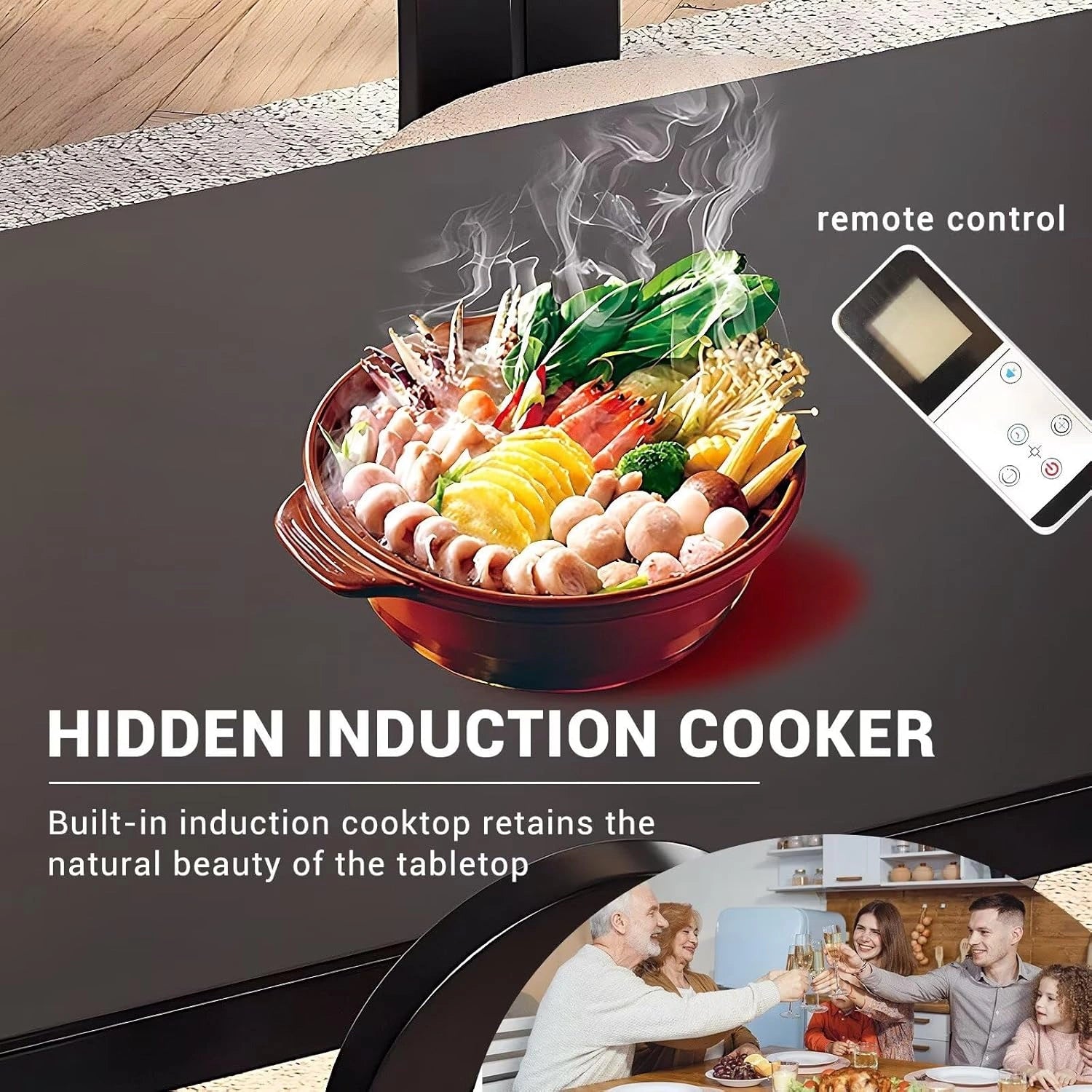 Multi-functional Features: Equipped with built-in sockets for fast charging of your electronic devices, this product also comes with a concealed induction cooker operated via remote control for seamless use. Its sleek, trendy design retains a clean, natural tabletop surface, while the rounded corners effectively prevent accidental bumps and scratches.