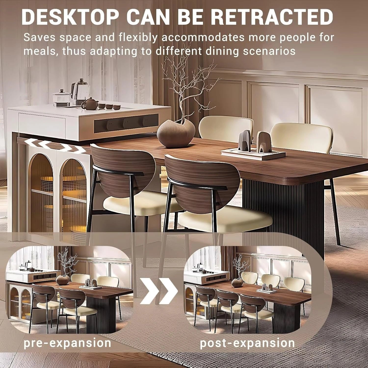 Flexible Dining Space: Its tabletop can be extended up to 55 cm to accommodate 4-6 persons. It is designed so that you can use it for different functions: pushing in for smaller gatherings or quickly pulling out for larger gatherings, welcoming friends and family with ease.