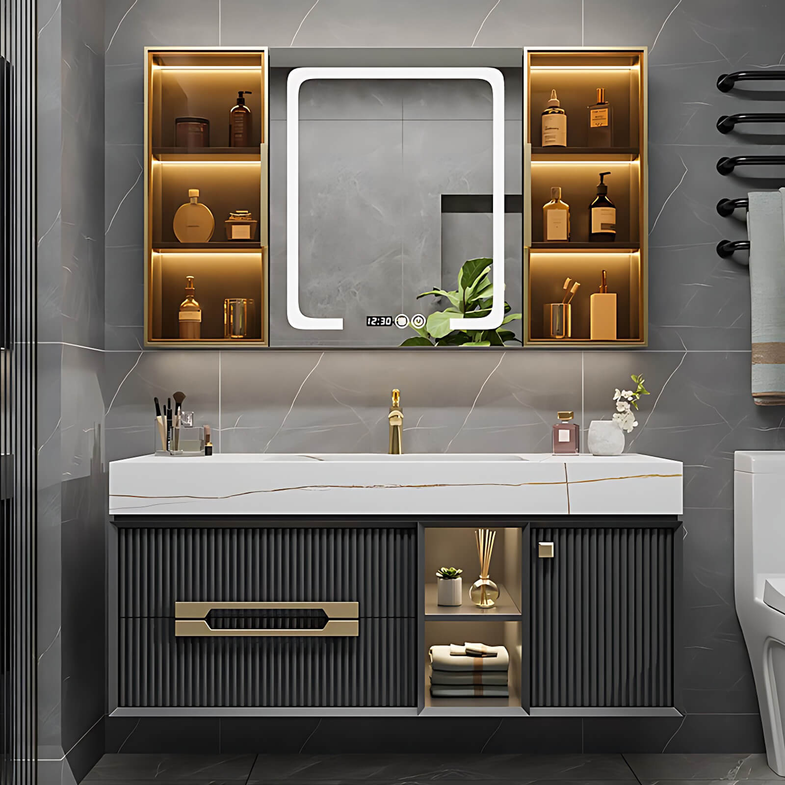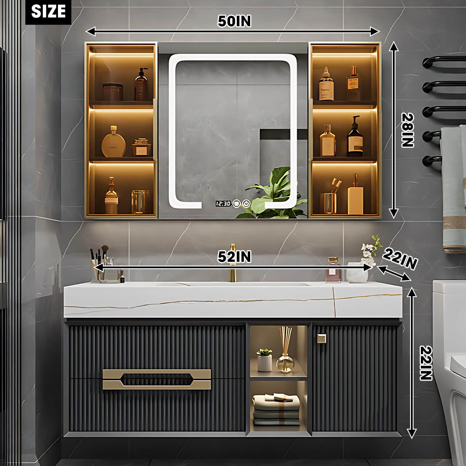 Introducing our exquisite Floating Bathroom Vanity with Single Sink and Defogging Mirror Cabinet, a fusion of elegance and functionality for your bathroom space. Elevate your daily routine with this meticulously crafted piece designed to enhance both aesthetics and practicality.