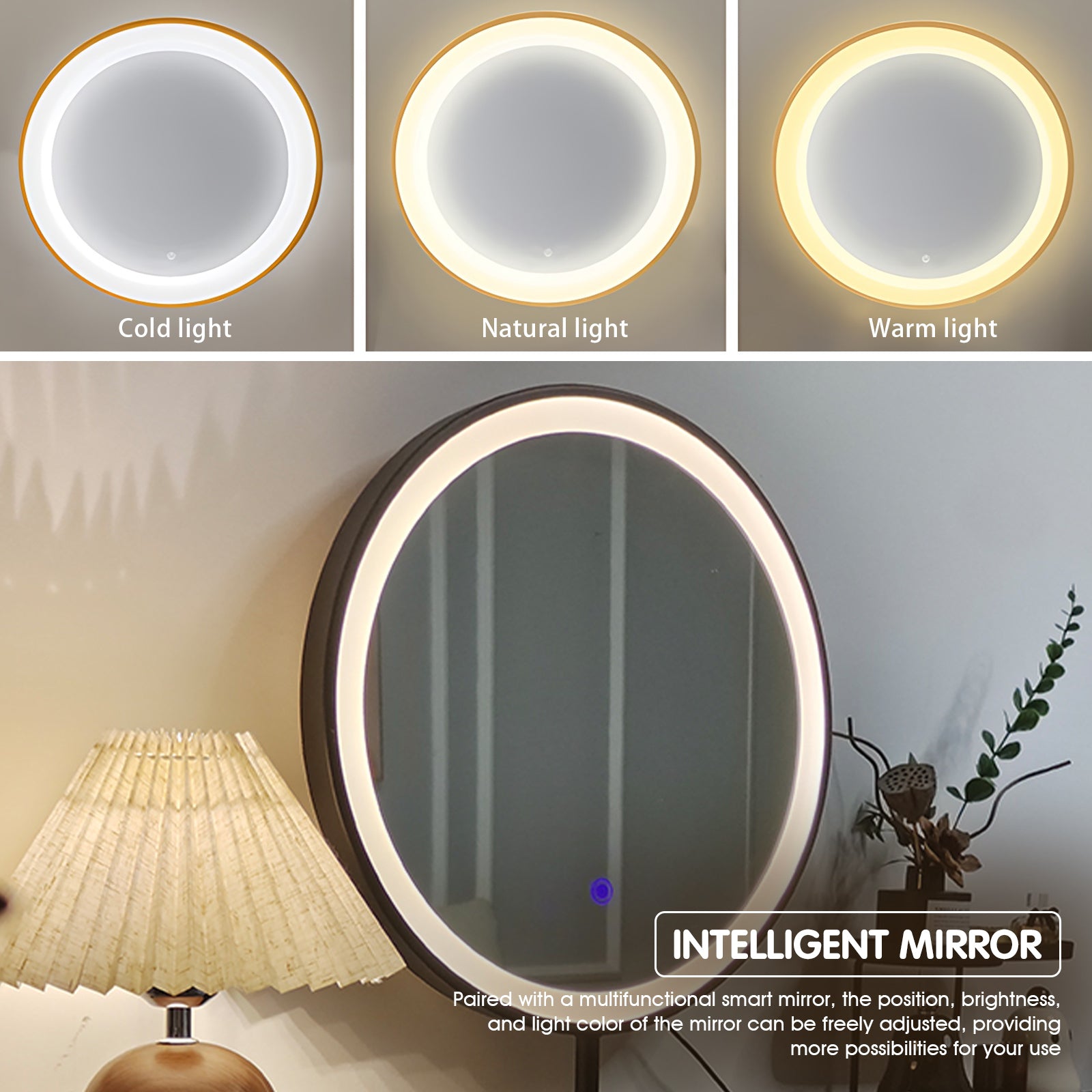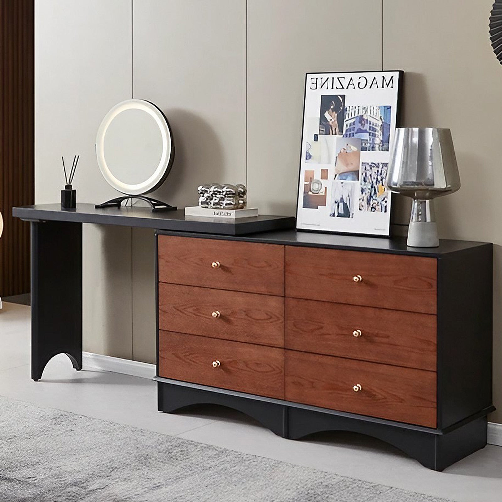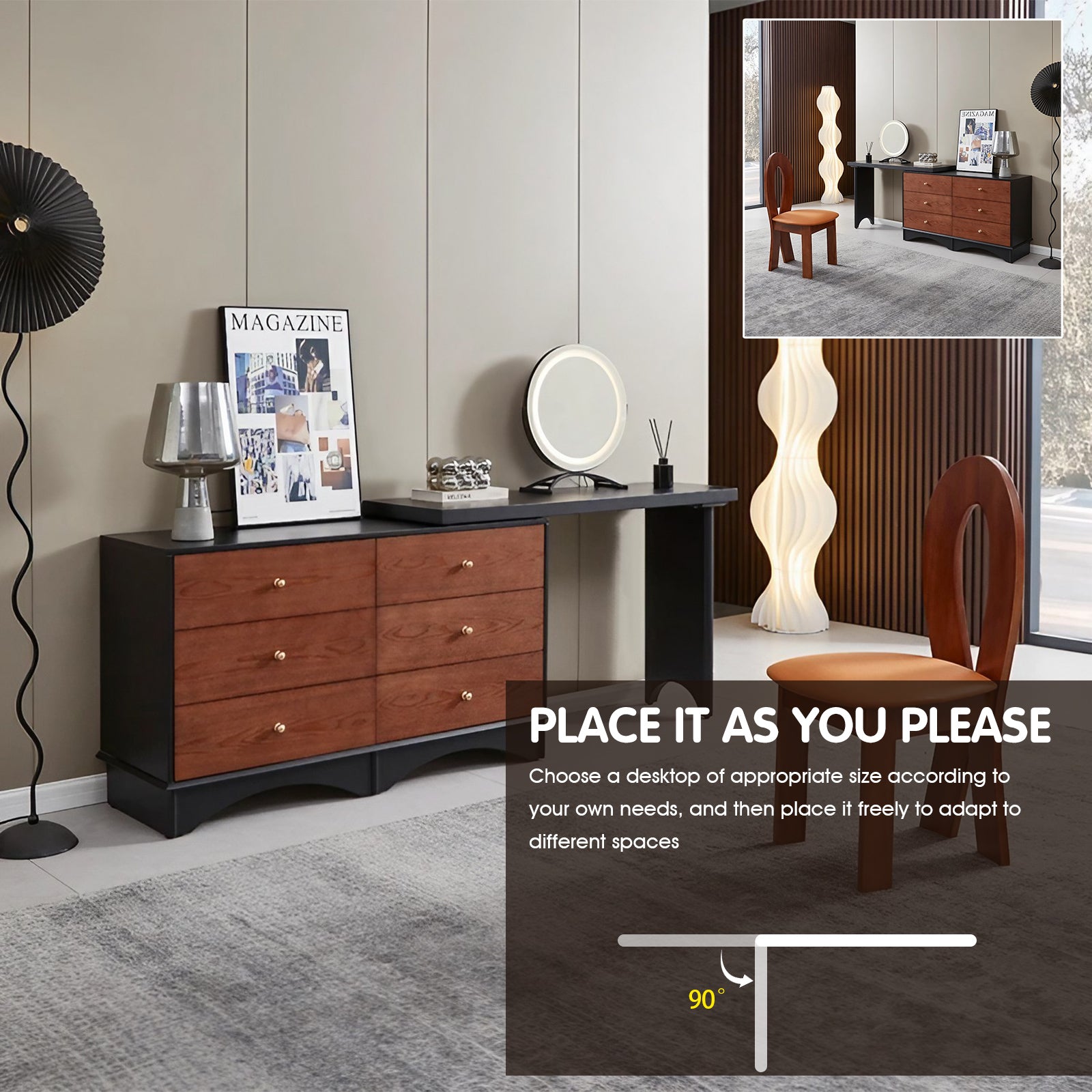This modern black and walnut makeup vanity offers a sleek design with 6 spacious drawers, providing ample storage. Paired with a round LED mirror for perfect illumination, it combines luxury and practicality for contemporary spaces.