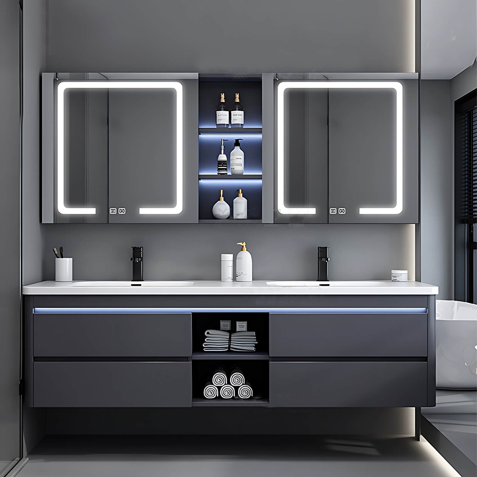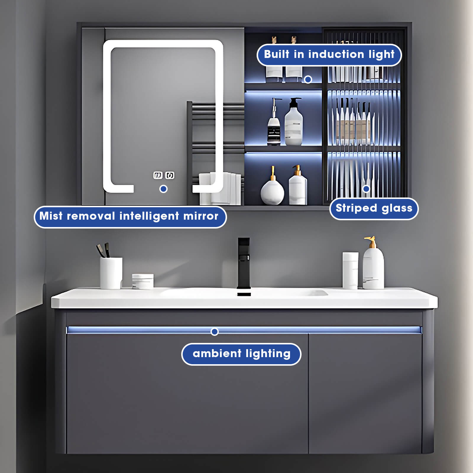 Fashion quality life: This bathroom cabinet perfectly showcases quality life and fashion taste. The blue ambient light instantly creates a warm and noble atmosphere. The bathroom cabinet design is exquisite and fashionable, with a streamlined appearance and exquisite details, highlighting the luxury and uniqueness of the brand.
