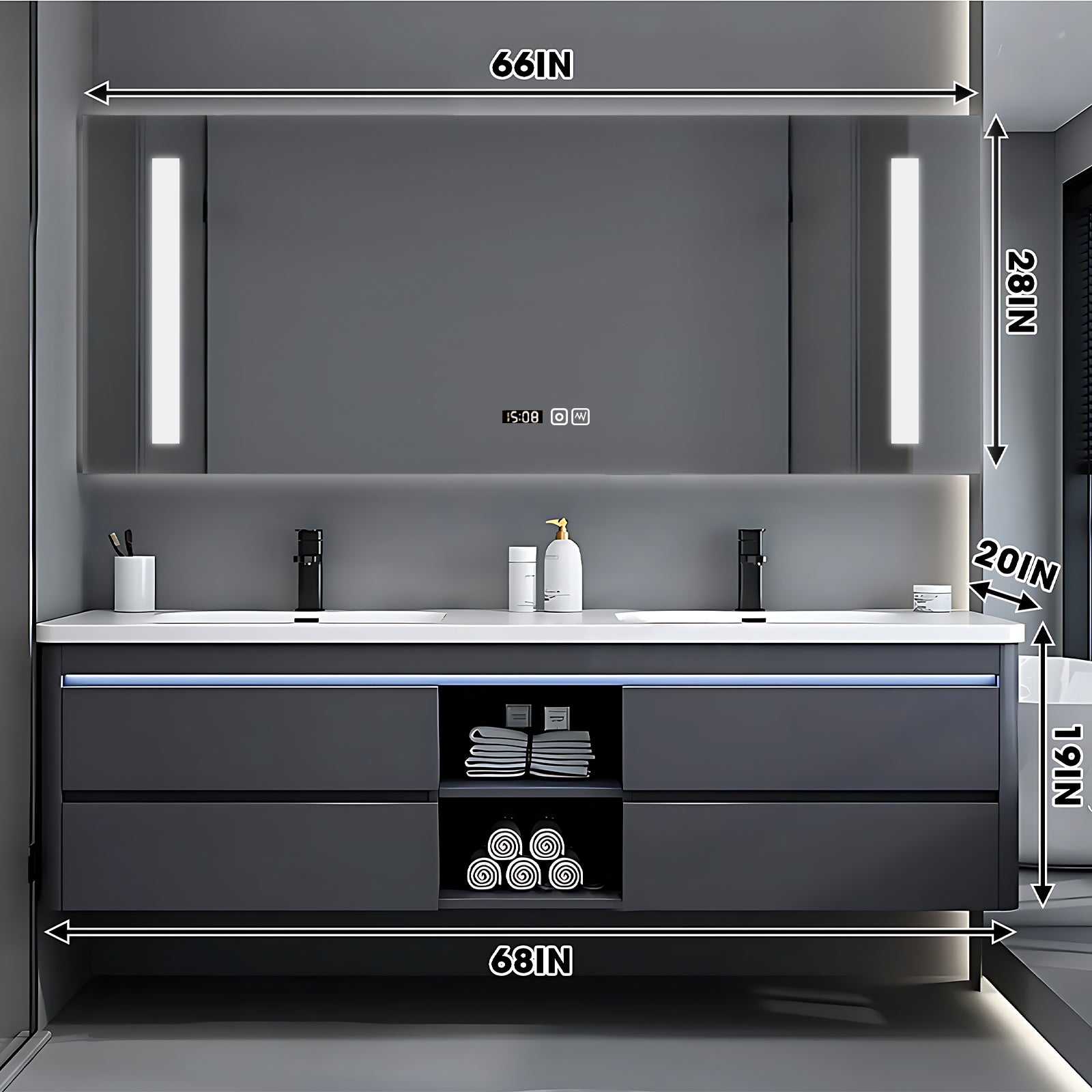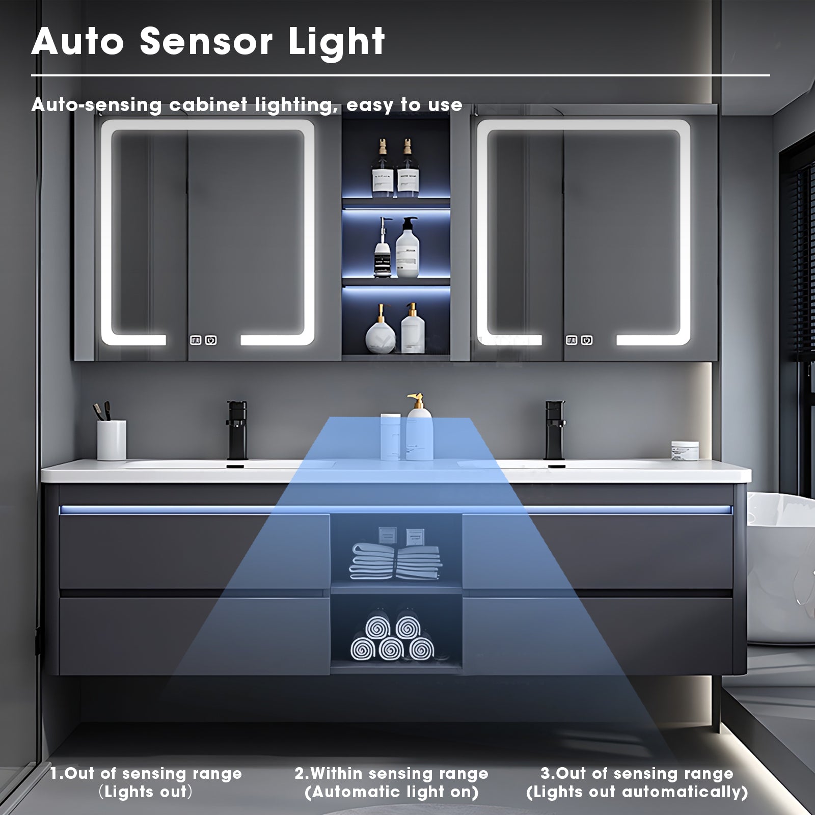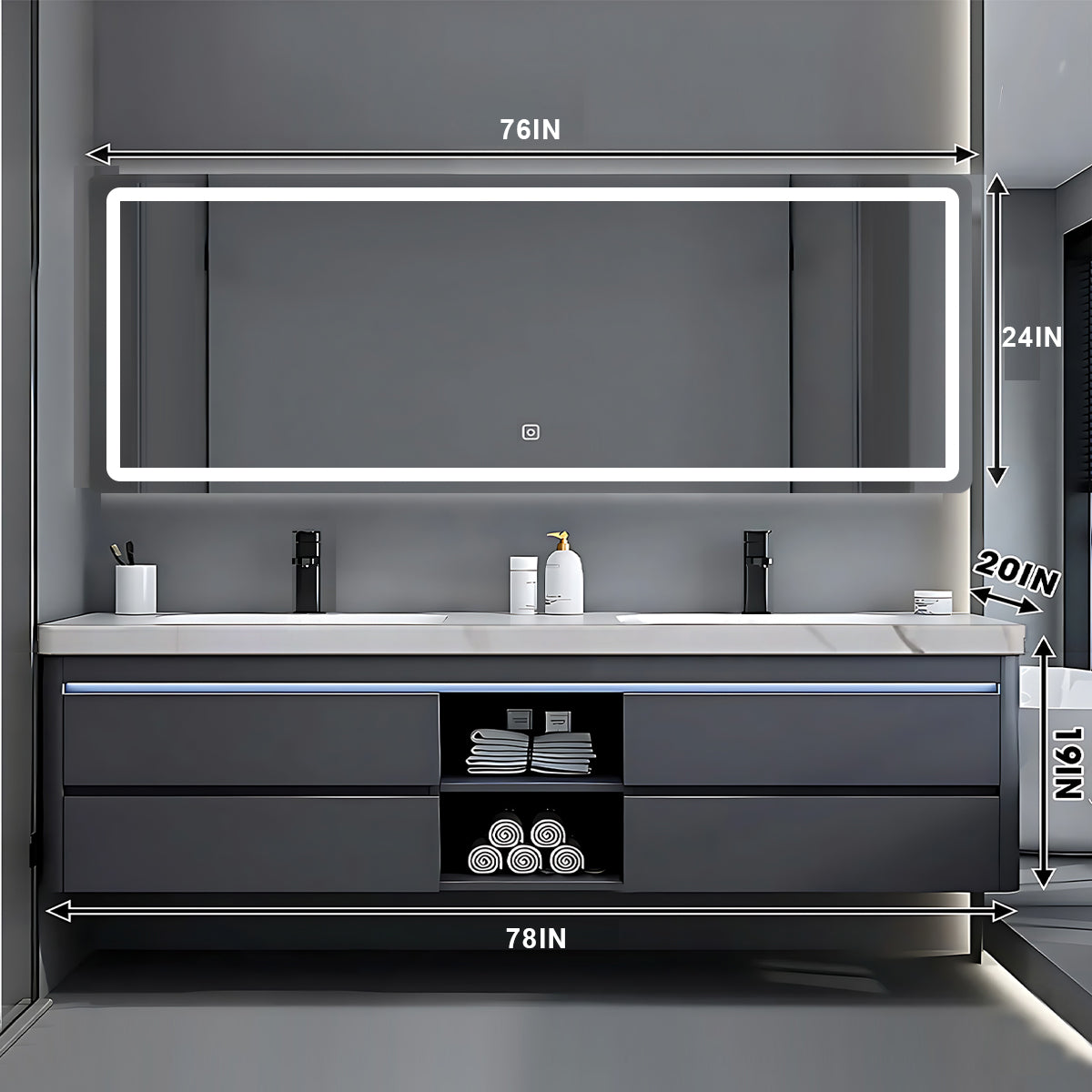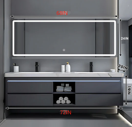 Intelligent Defogging Lighting Mirror: Adopting LED mirror, built-in touch sensor light and defogging function, ensuring that the mirror is not affected by fog, always clear and bright, providing you with a fresh and worry free environment.