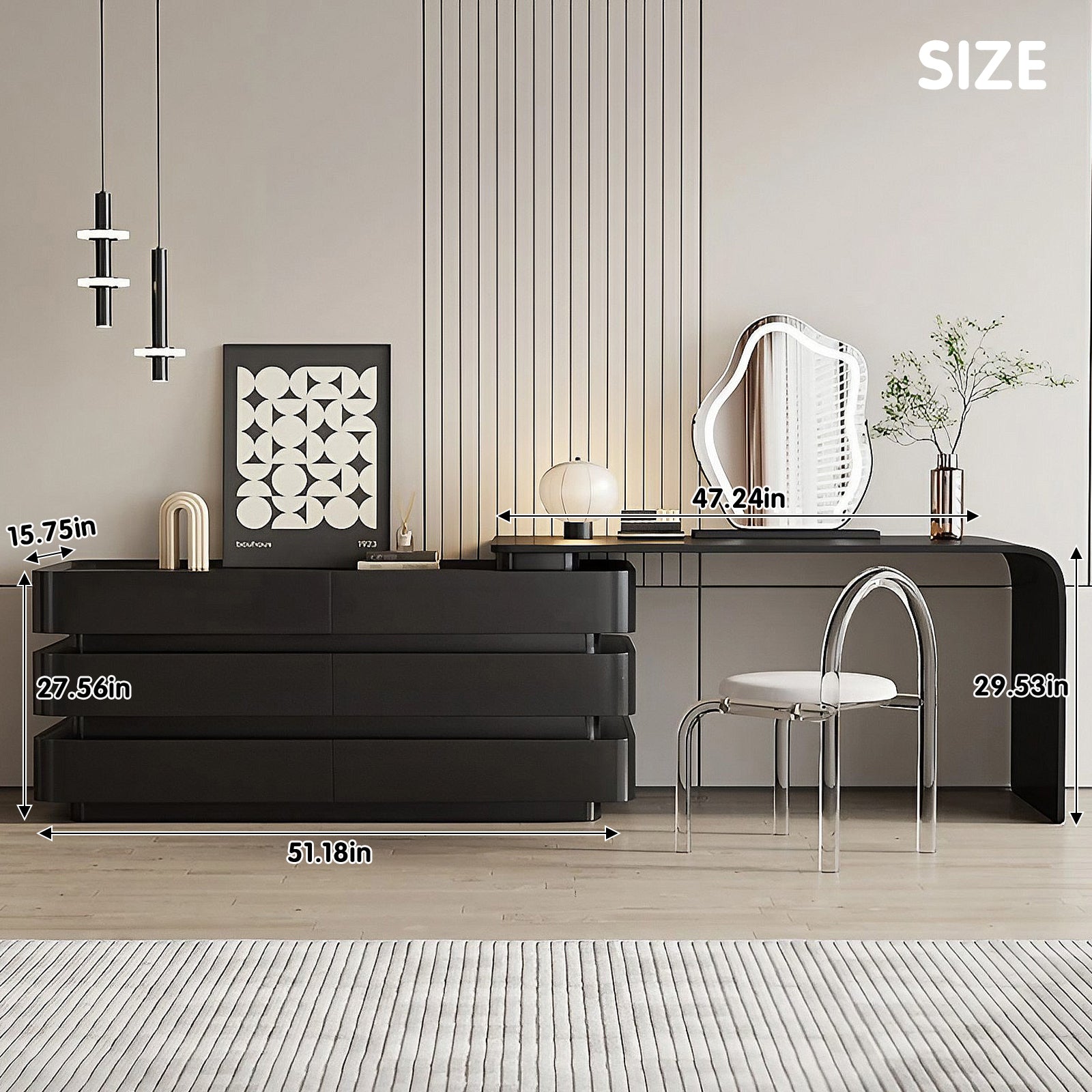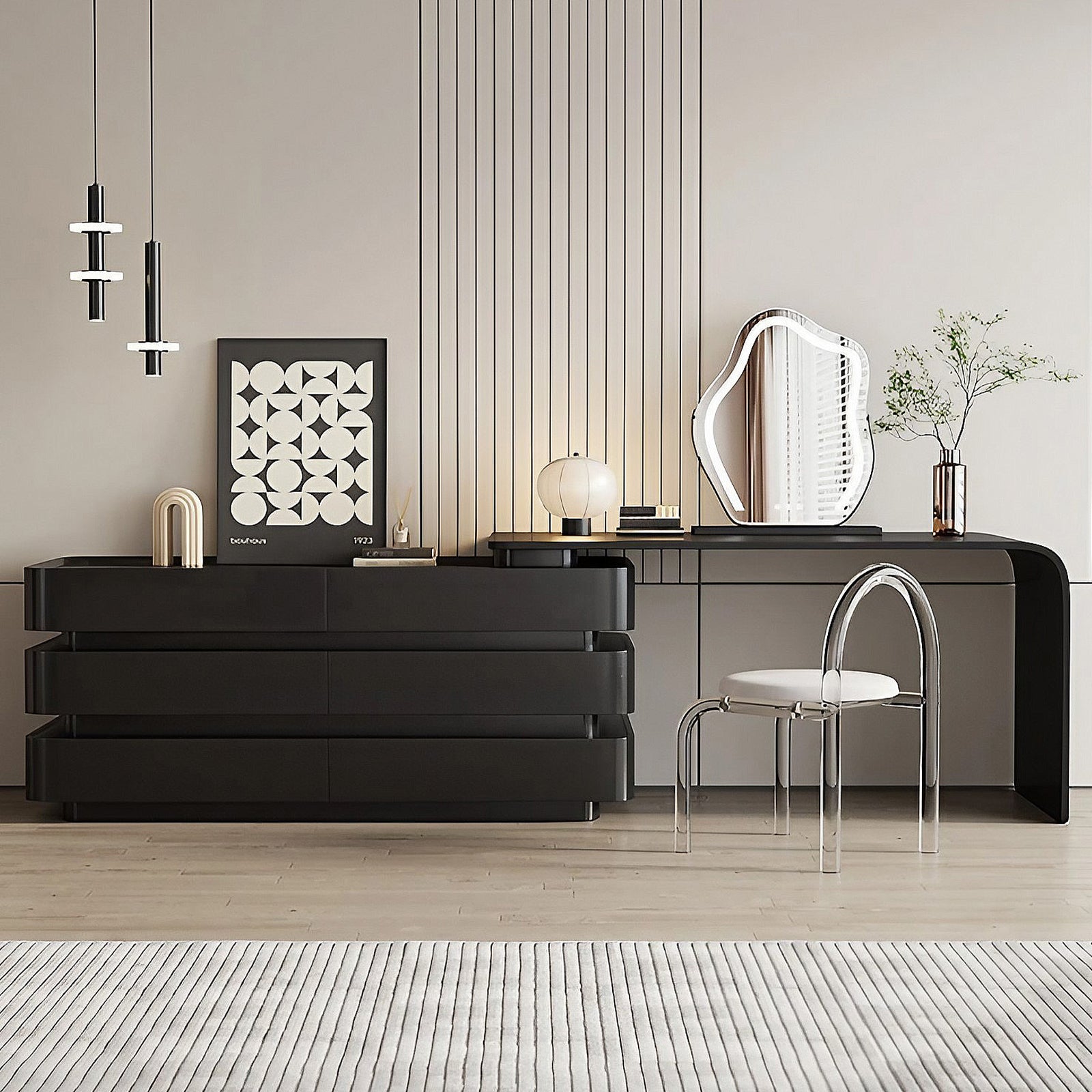 Elevate your space with this sleek, black extendable vanity featuring a curved silhouette and an artistic LED mirror. Designed for versatility and style, it blends functionality with modern aesthetics.