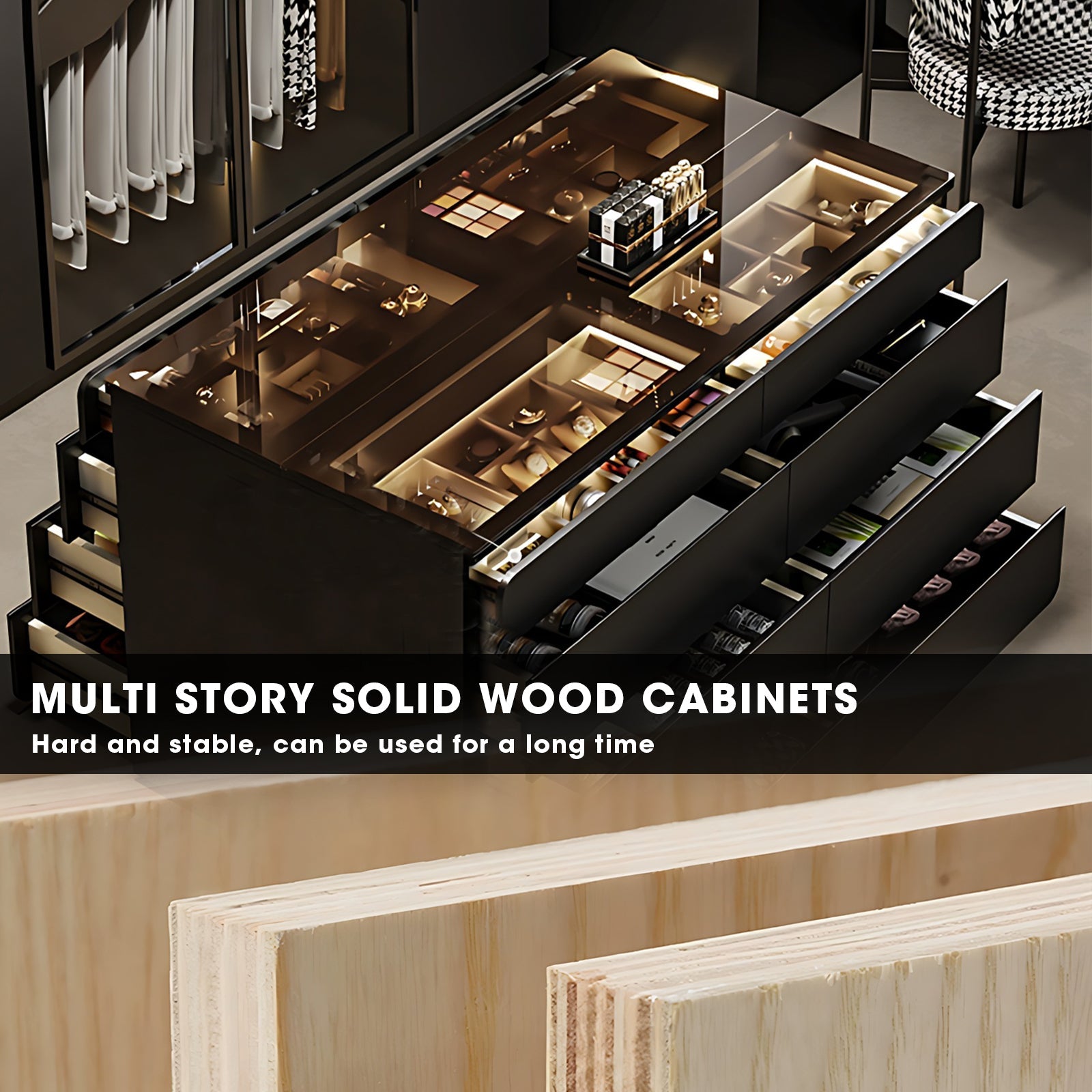 Introducing our Black Glass-Top Walk-In Closet Island, a luxurious and functional addition to your dressing space. This modern and sophisticated design seamlessly combines style with practicality, elevating your closet to new heights of organization and aesthetics.