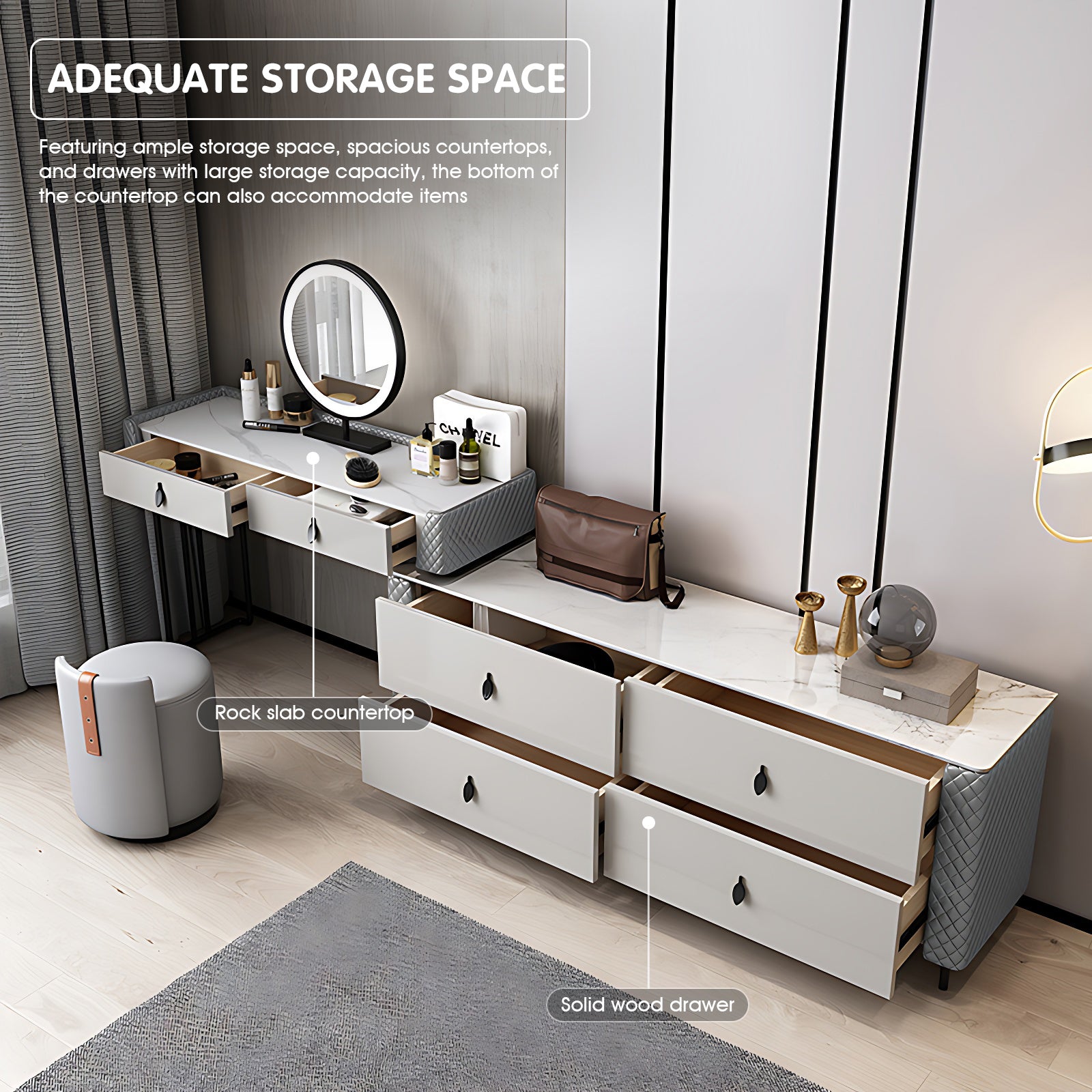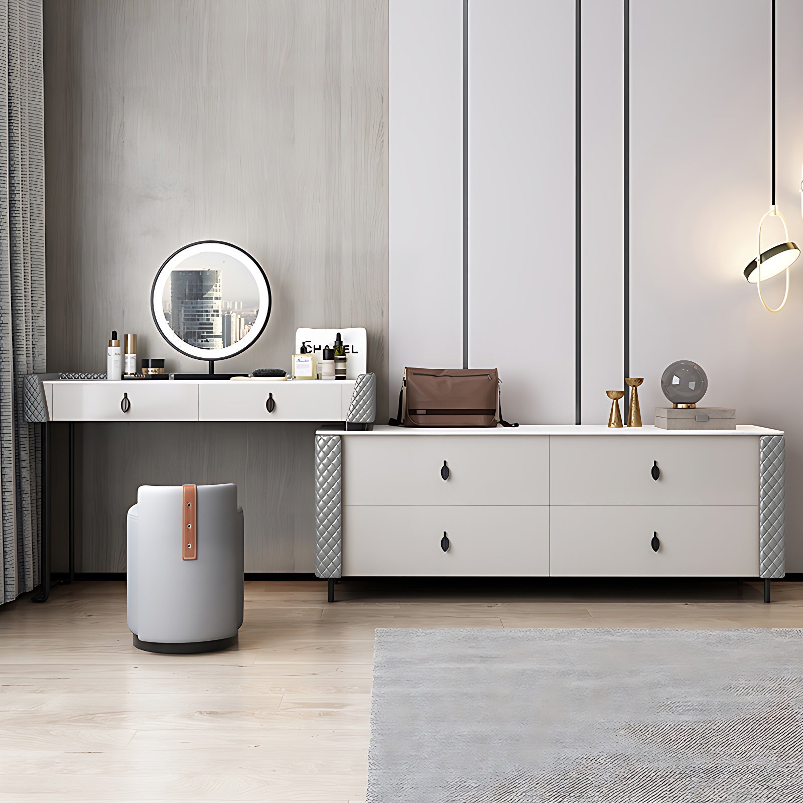 This sleek light gray makeup vanity features 6 drawers for storage, an expandable design, and a round LED mirror with adjustable lighting. It combines modern style with practical functionality, perfect for contemporary spaces.