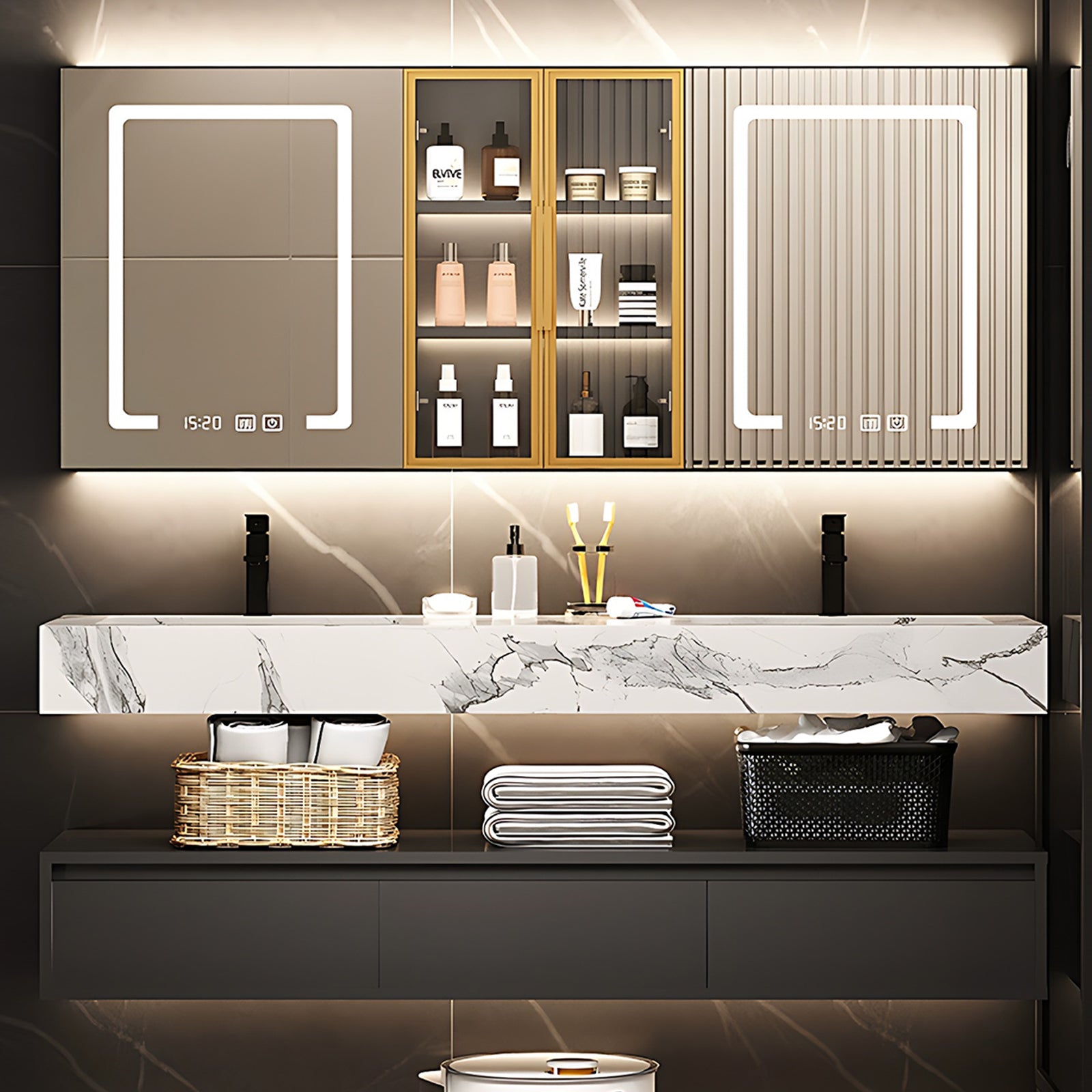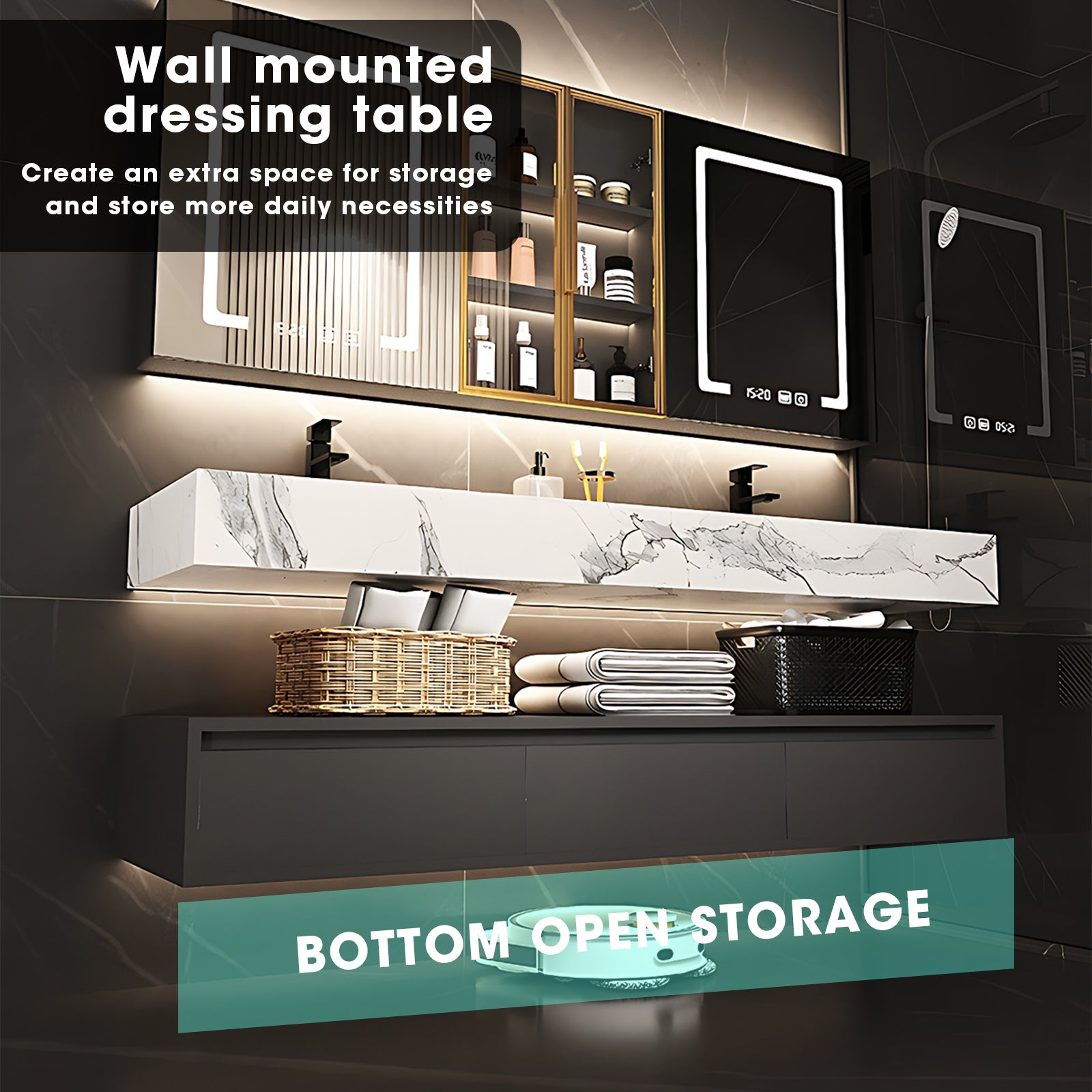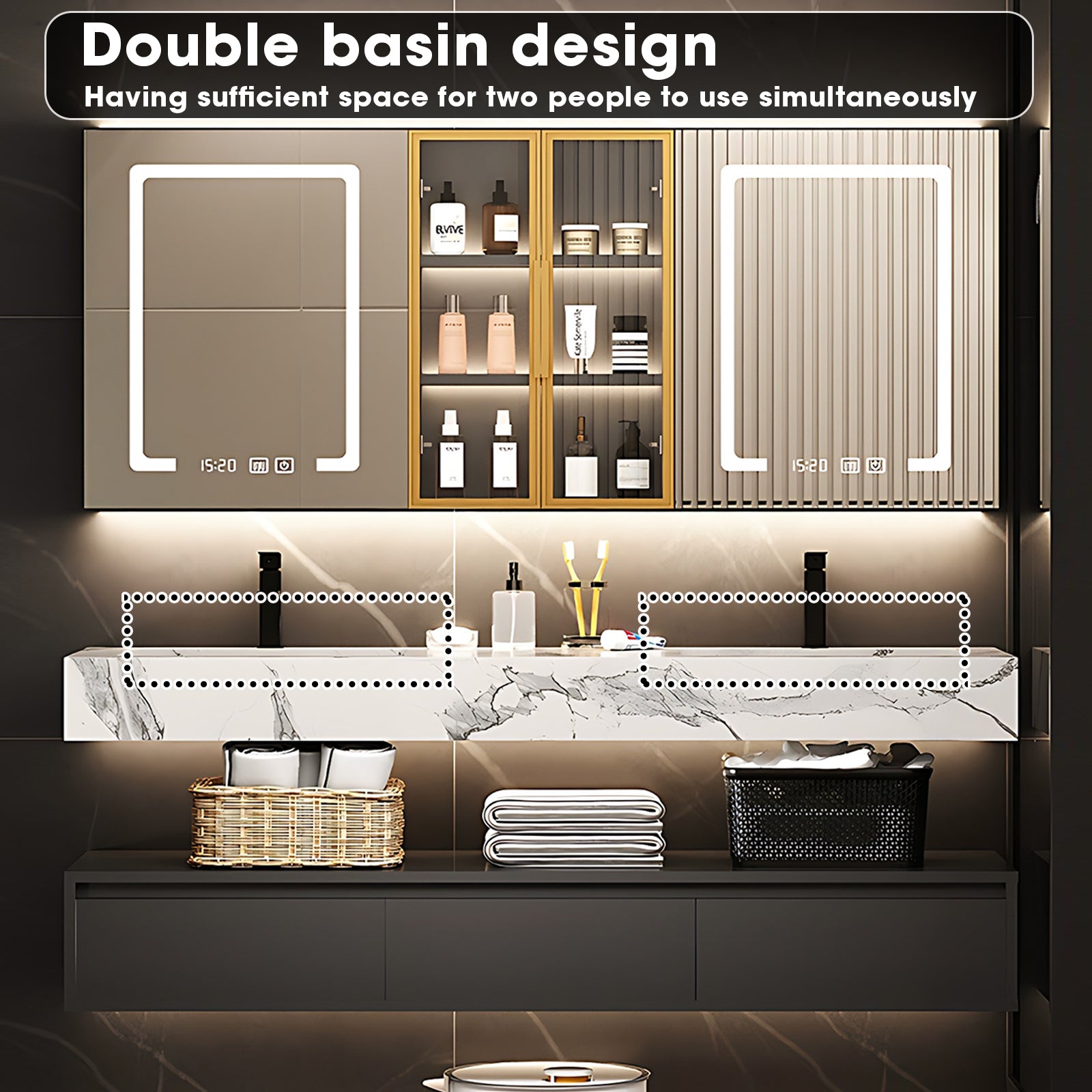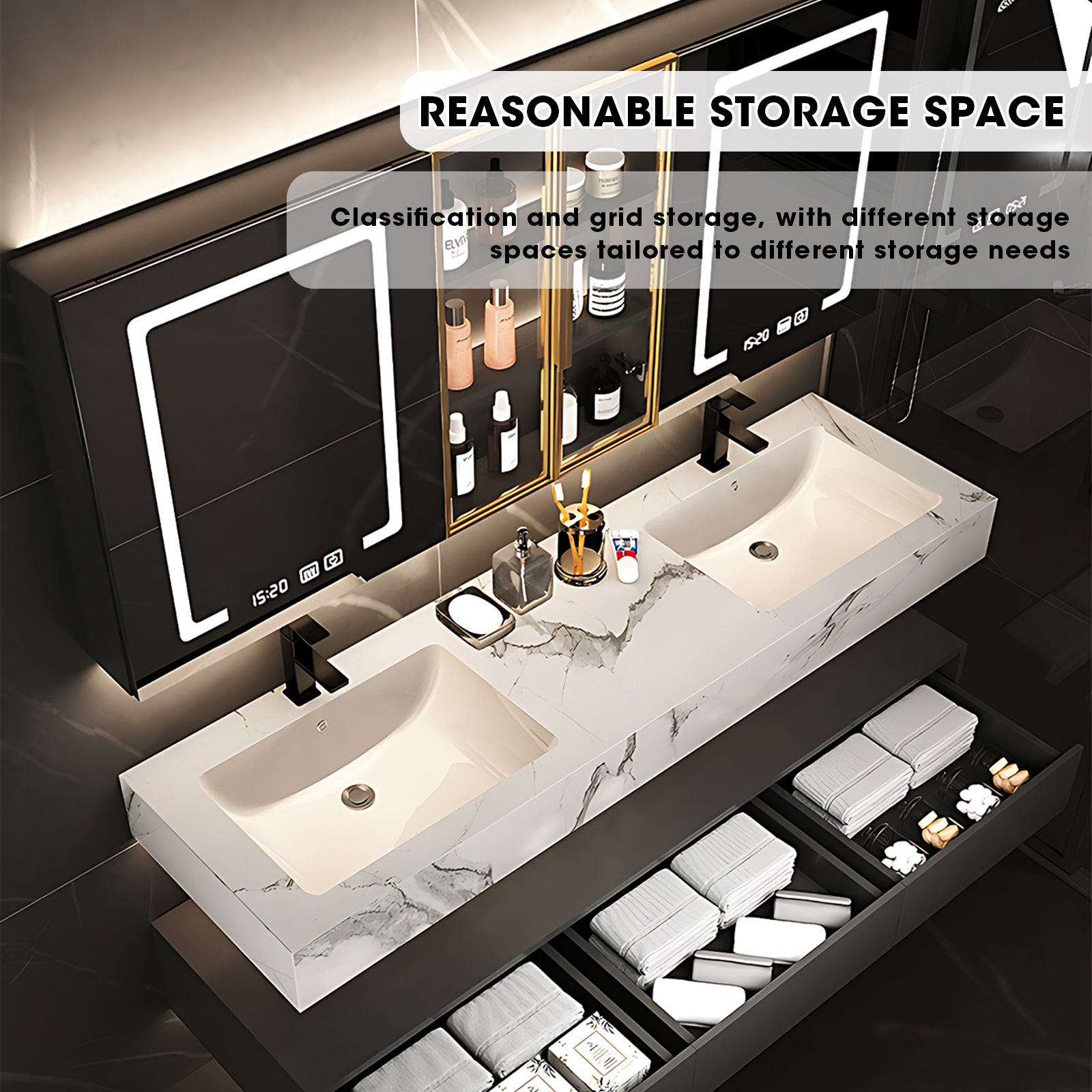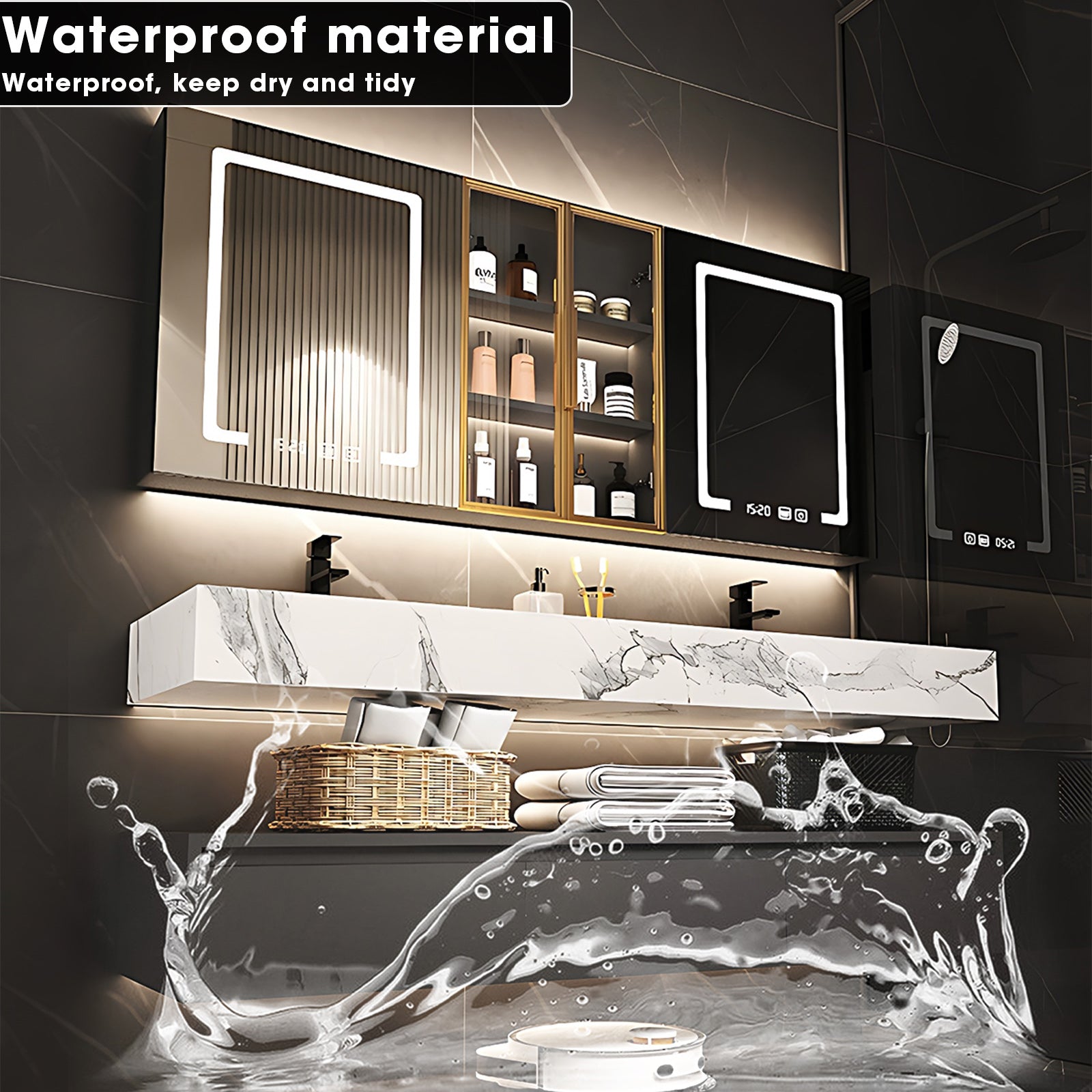 LED Mirror Brilliance: Illuminate your grooming rituals with the integrated LED mirror. Not only does it provide optimal lighting, but it also adds a touch of modern sophistication, creating a well-lit and stylish focal point in your bathroom.