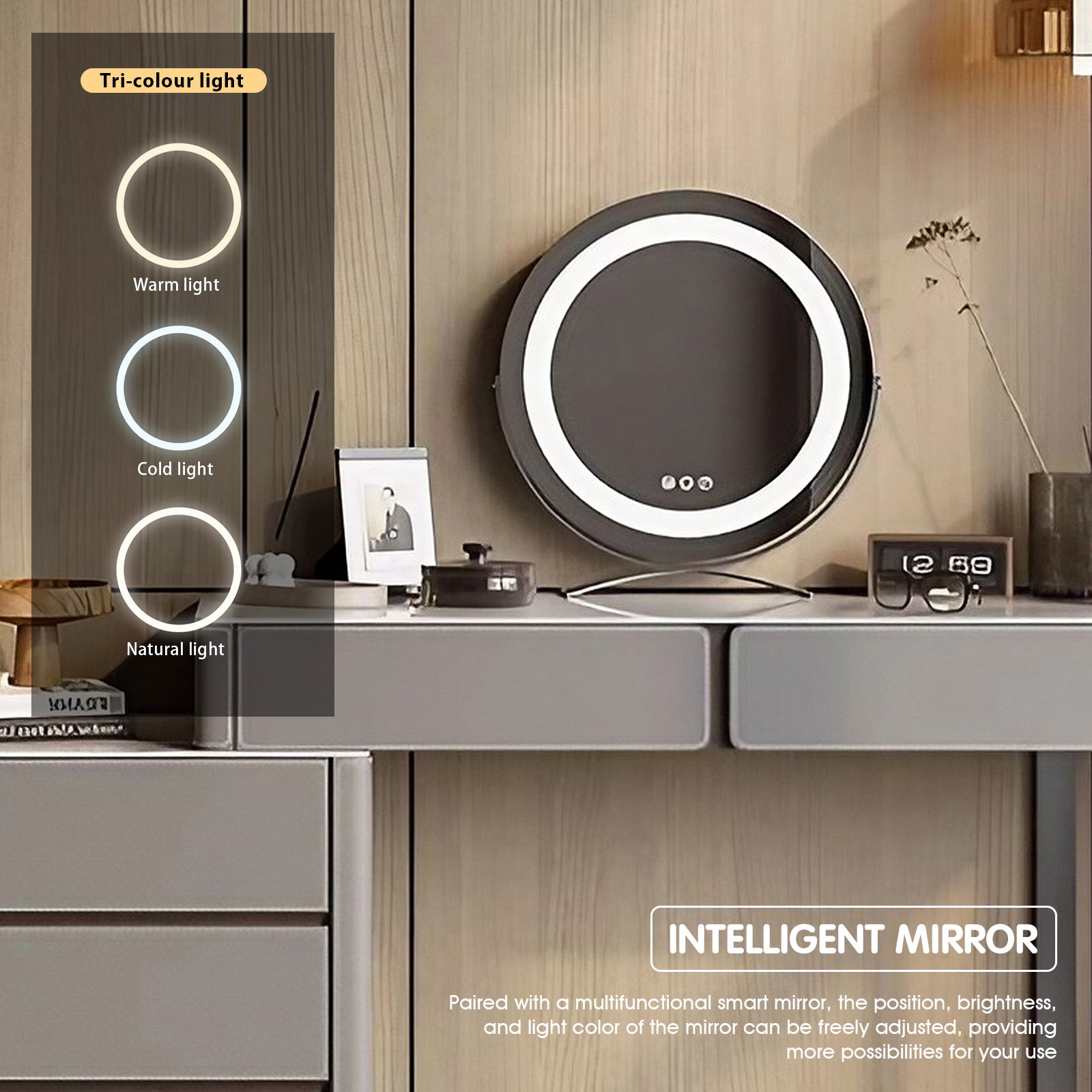 LED Intelligent Mirror: The adjustable LED mirror provides perfect lighting for makeup and grooming. The energy-efficient lights are designed to suit different needs, ensuring clarity and brightness.