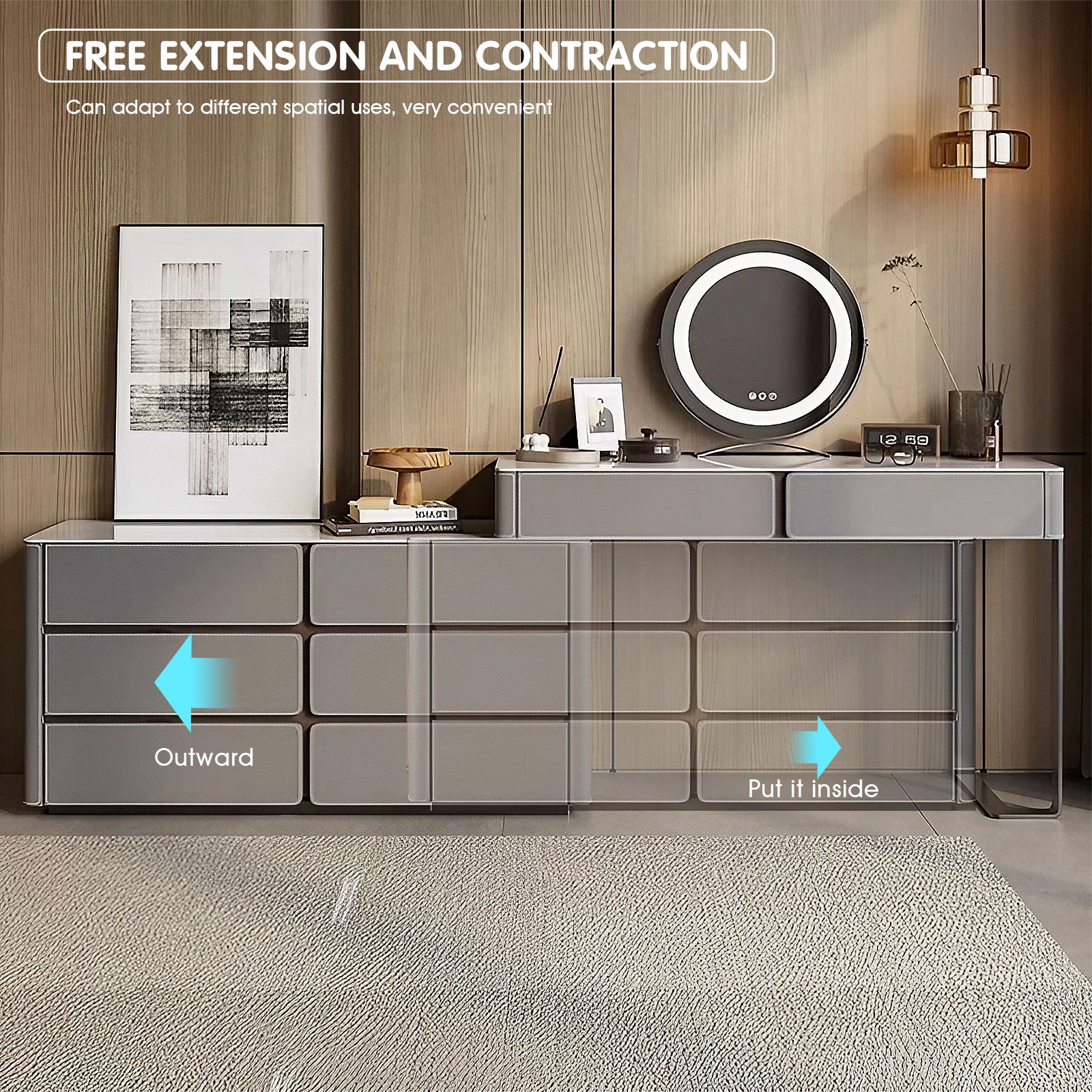 Rotatable Design: With a flexible, extendable structure, this vanity adapts to your space. The rotatable mirror and extendable tabletop provide ultimate flexibility for various room sizes.