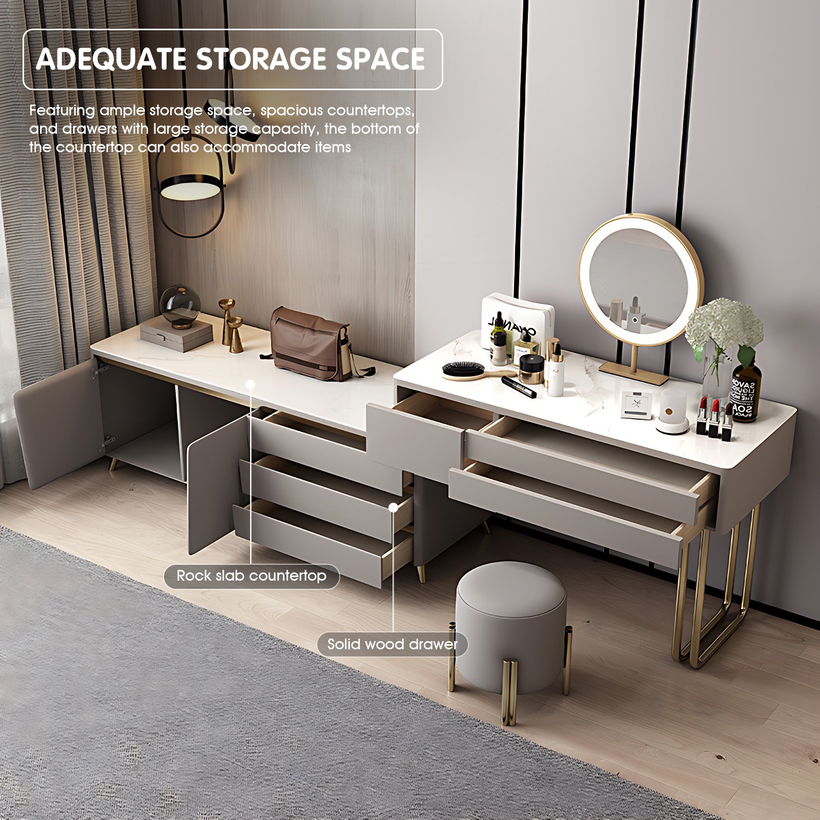 Spacious Storage Options: Designed with multiple drawers and compartments, this vanity provides ample storage for makeup, skincare, and other beauty essentials, keeping everything neatly organized and easily accessible.