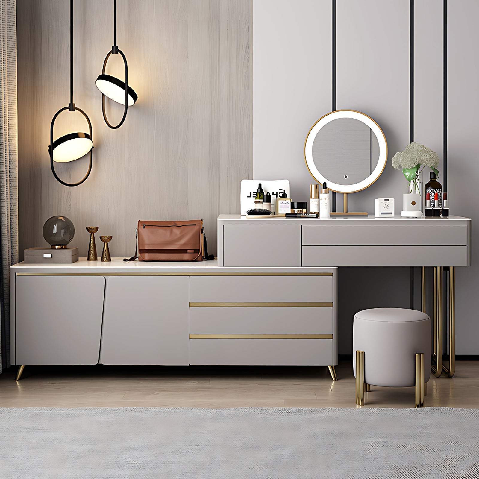 This chic light gray makeup vanity combines sophisticated design with functional features. Finished with subtle gold accents and a sleek round LED mirror, it’s perfect for adding a modern touch to your space while providing ample storage and style.