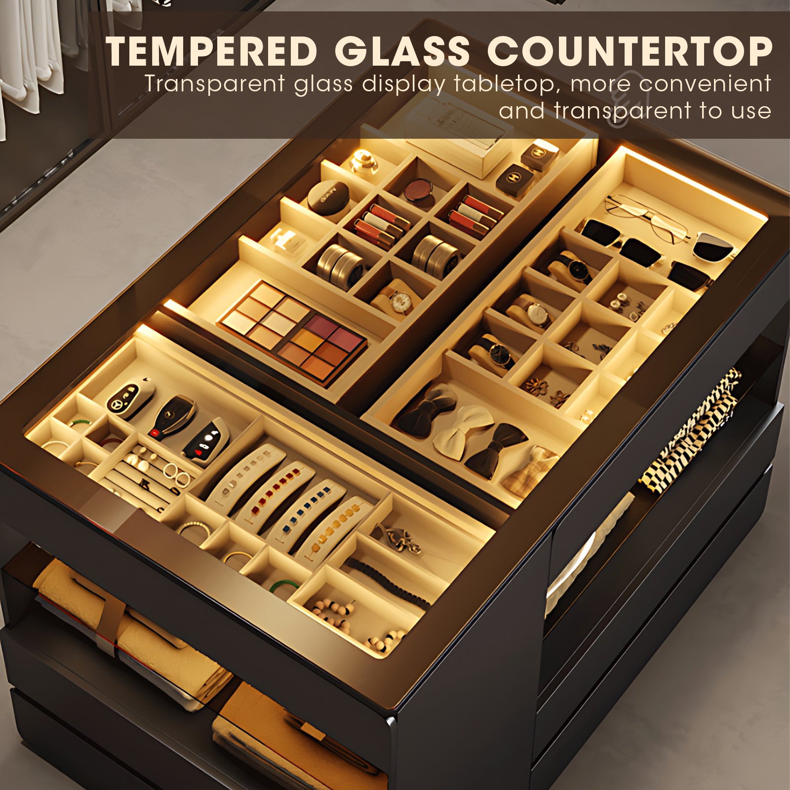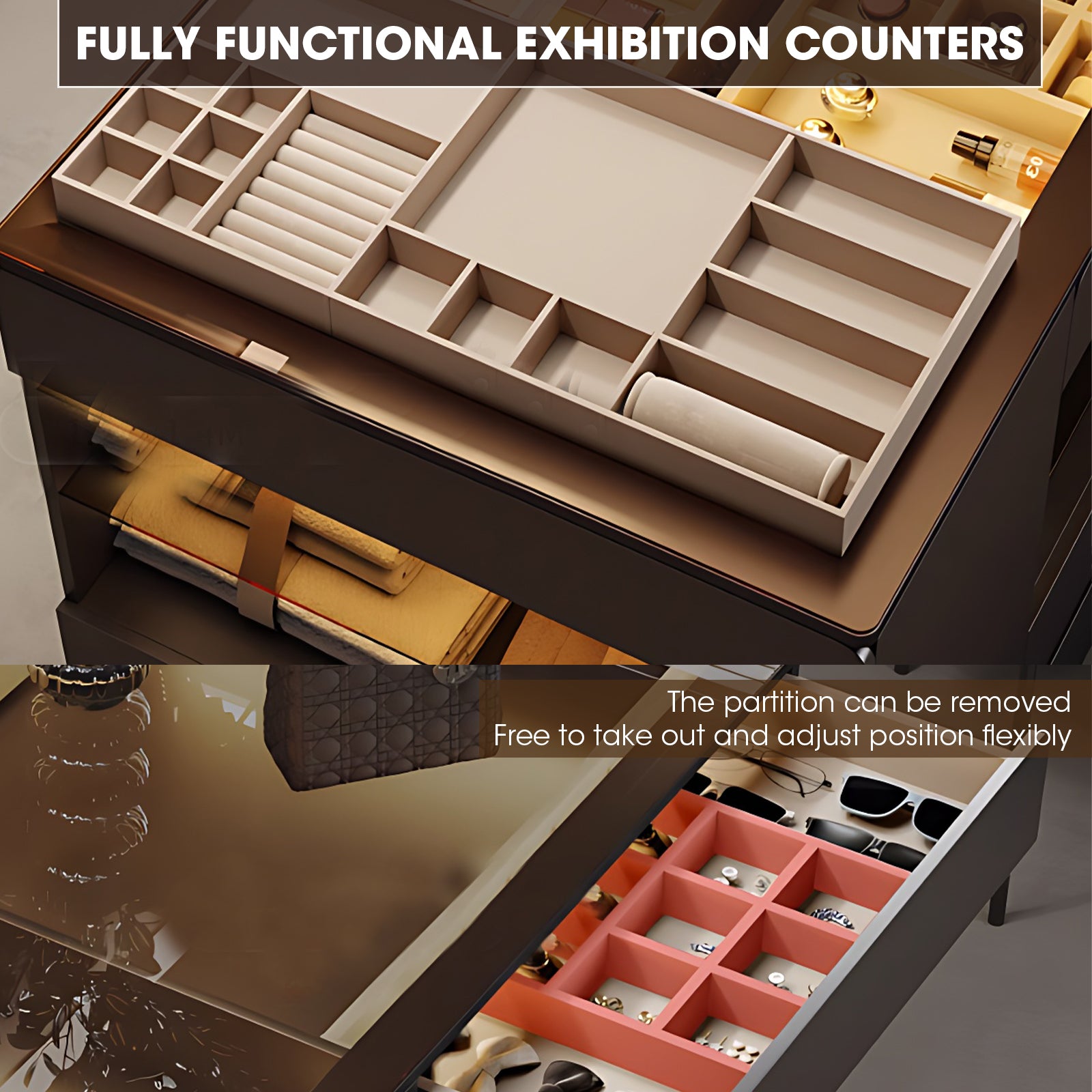 Glass Top Jewelry Display Case: This display case has a high-grade tempered glass top, exuding unparalleled sophistication. The full-screen tempered glass surface has excellent heat resistance and easy maintenance, ensuring it retains its original appearance for a long time. Designed with a panoramic transparent skylight concept, it not only displays your precious jewelry with amazing clarity, but also improves visibility, making each piece of jewelry easy to pick up and pleasing to the eye.