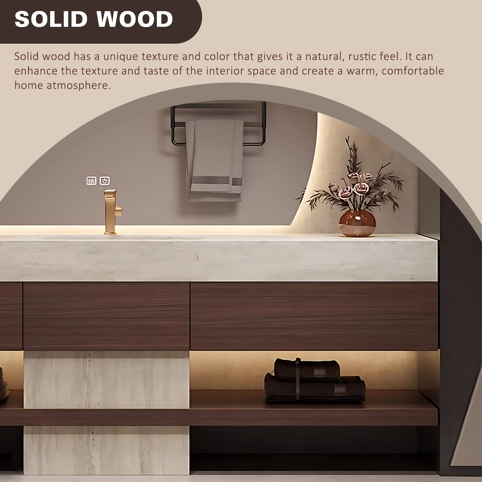 Refined Luxury Design: The combination of natural solid wood and a stone-like countertop adds a luxurious touch, perfectly complementing modern, minimalist, or high-end bathroom interiors. It's not just a vanity—it's a statement of style and quality.