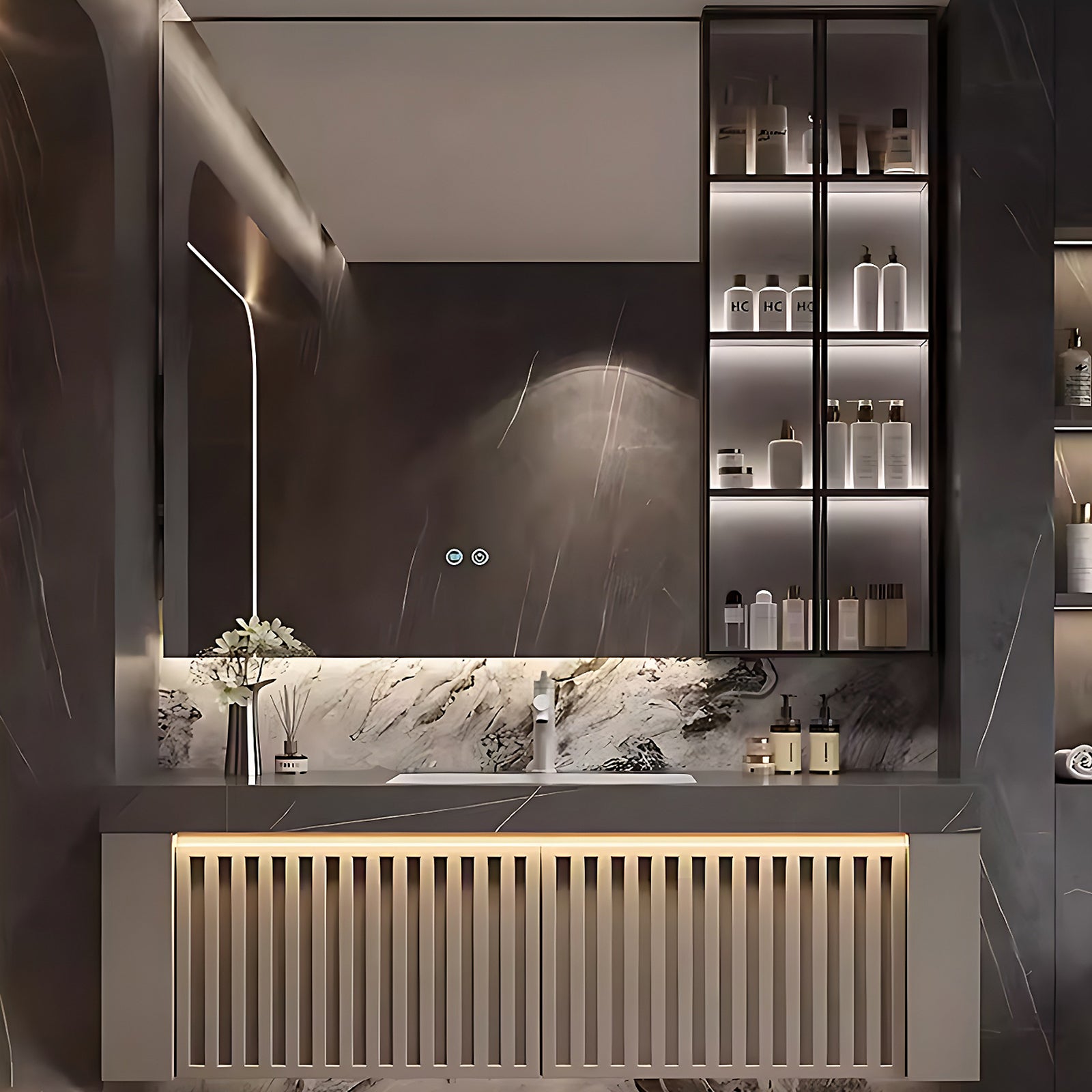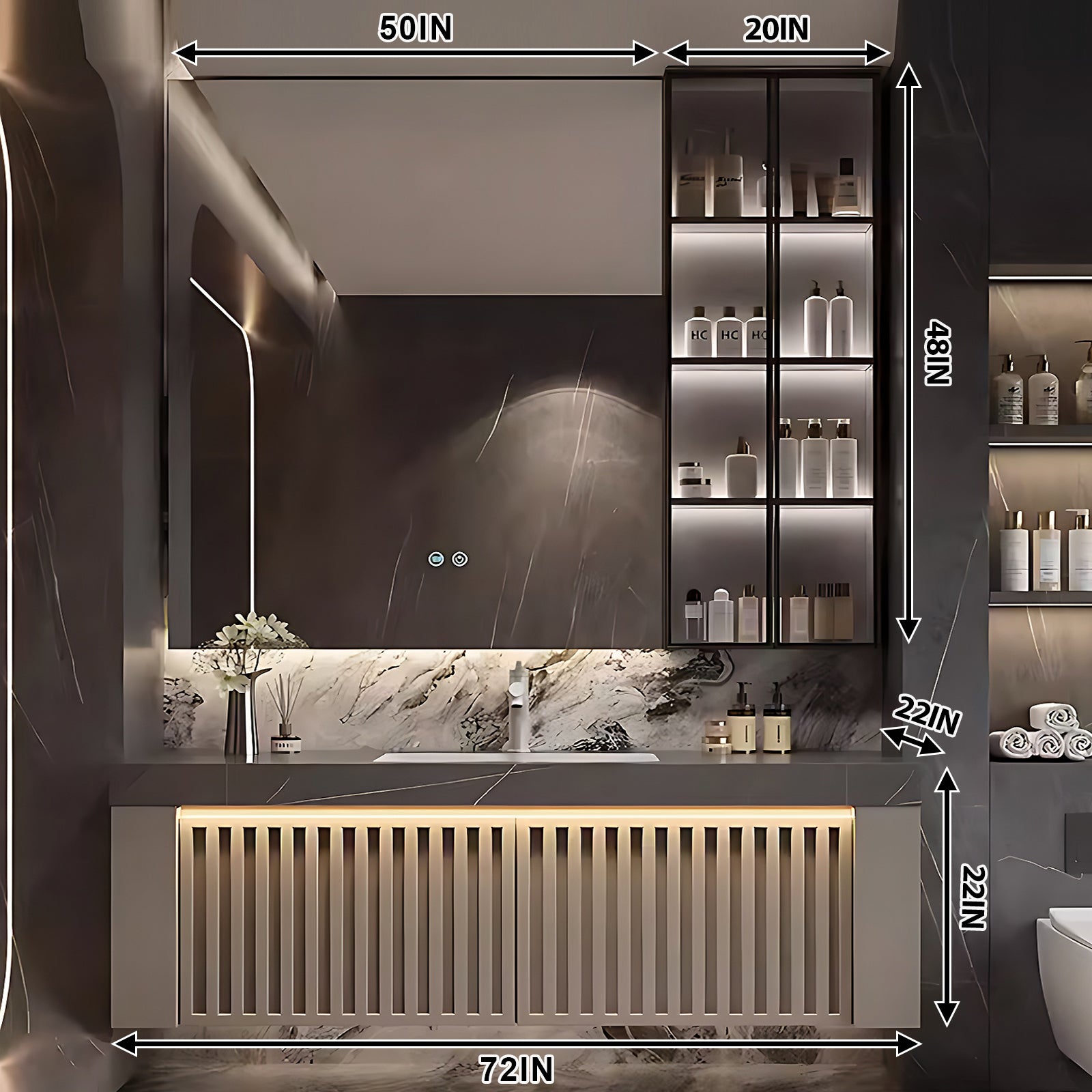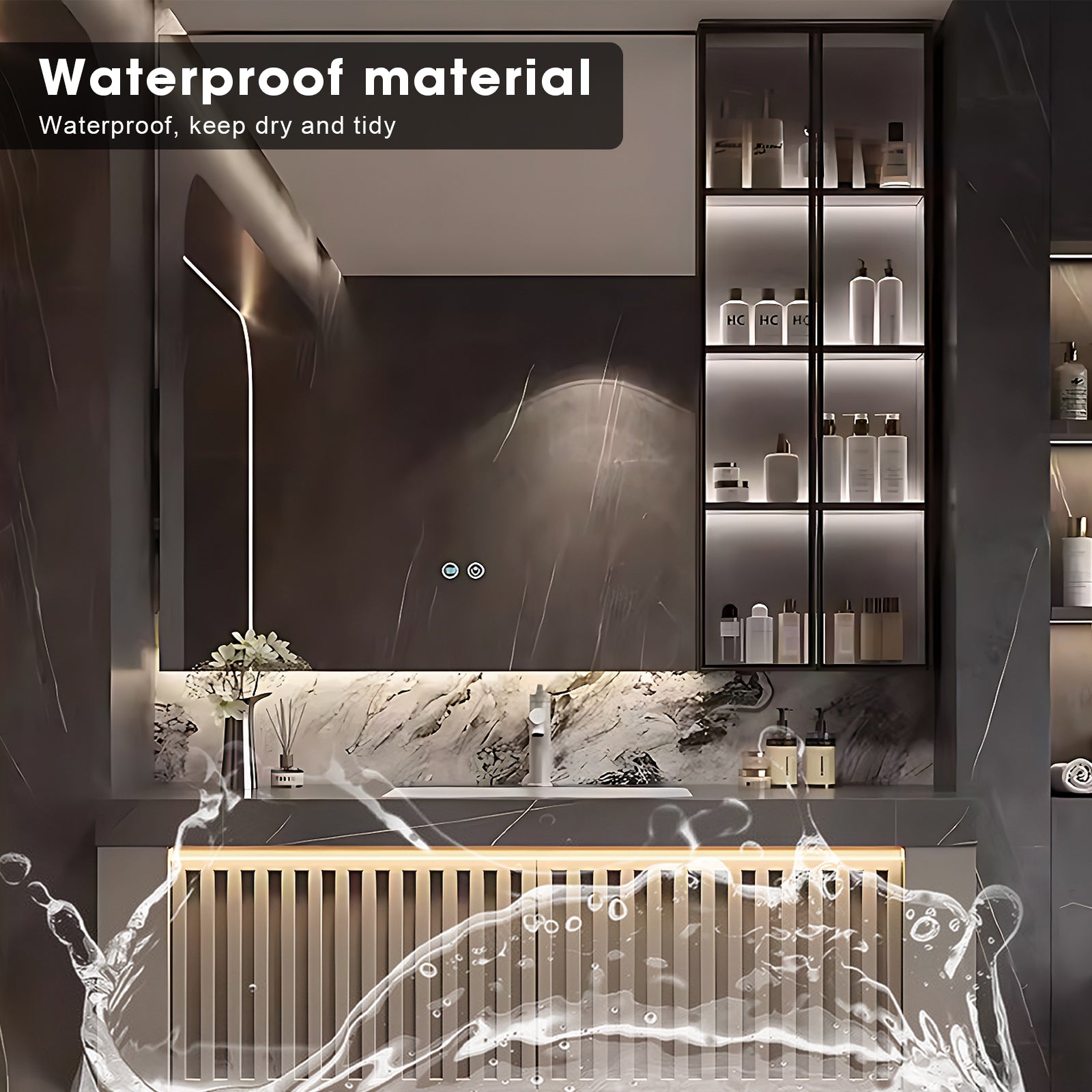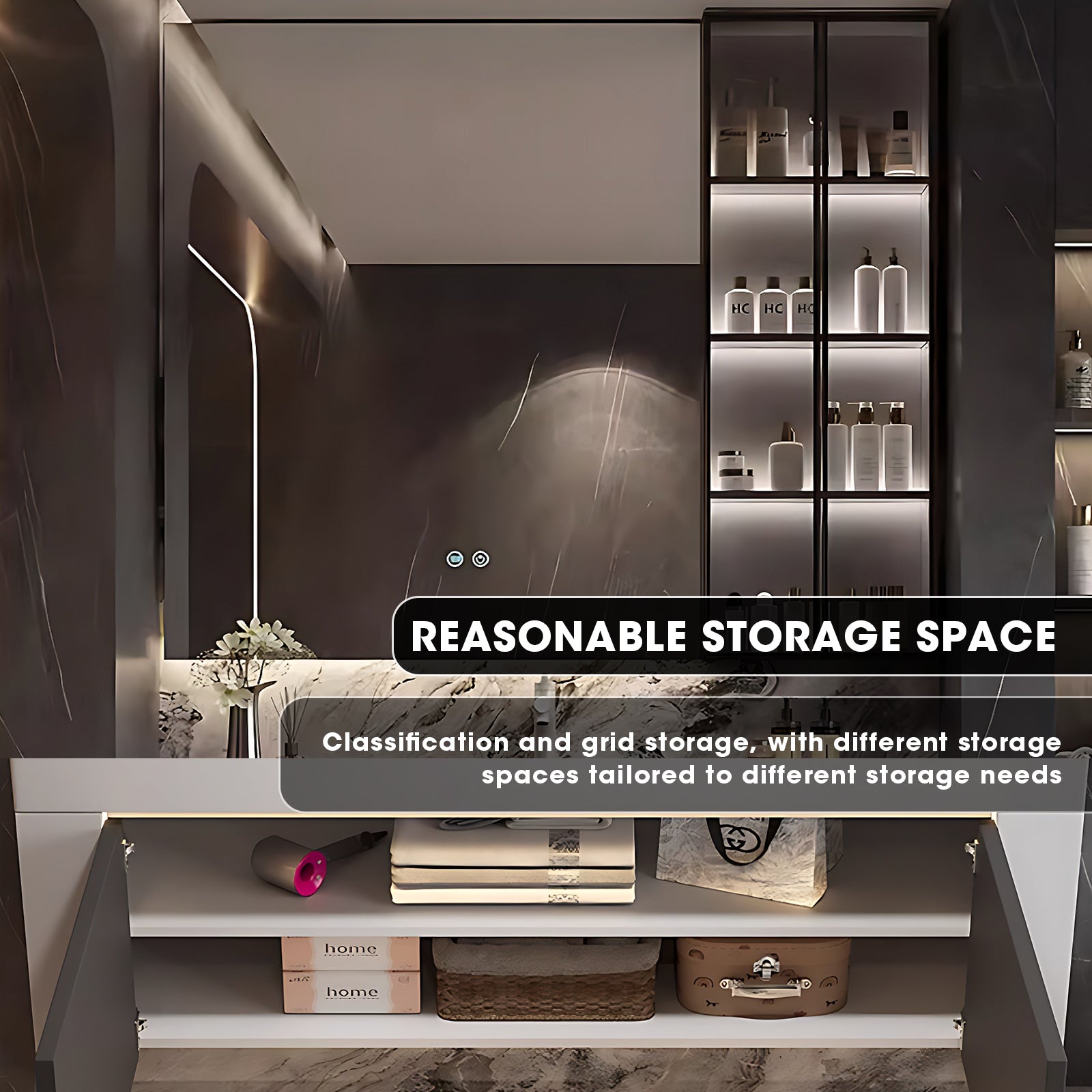 Introducing our Single Sink Bathroom Vanity Set with Smart Mirror and Glass Door Cabinet, a harmonious blend of practicality and elegance that redefines your bathroom space. Crafted with meticulous attention to detail, this ensemble is designed to elevate your daily routine while maximizing functionality.