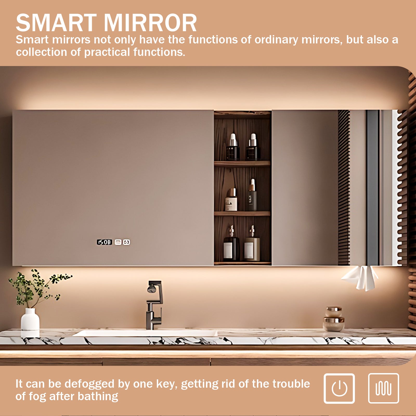 Smart Defog Mirror with LED Backlighting: Say goodbye to foggy mirrors with the built-in defogging feature that clears condensation instantly with a single touch. The integrated LED backlighting provides soft, even illumination, enhancing visibility while creating a calming ambiance.