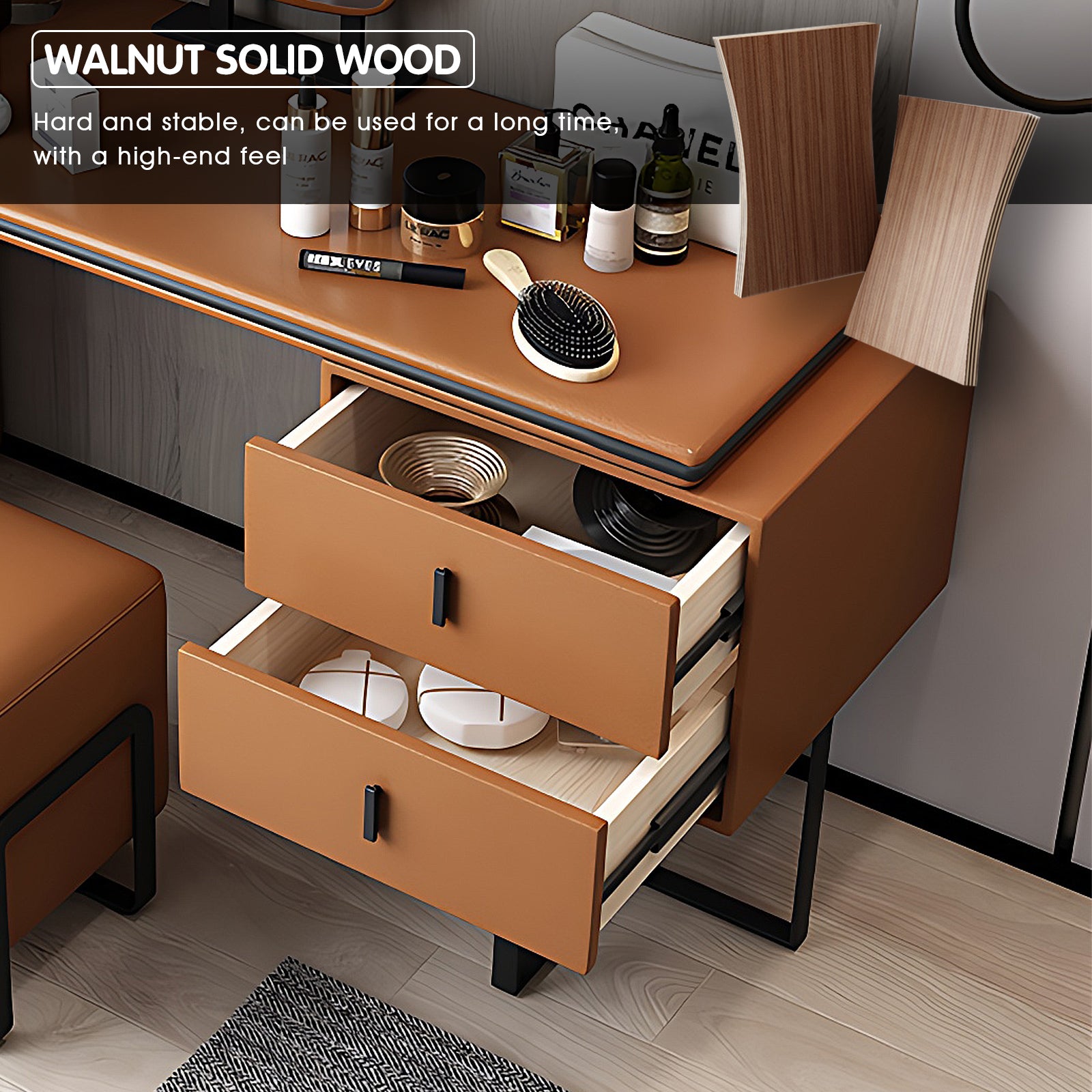This stylish makeup vanity combines solid wood and carbon steel for a durable, modern design. Featuring a leather-upholstered stool, LED mirror, and spacious drawers, it’s the perfect addition to any contemporary space, offering both function and luxury.