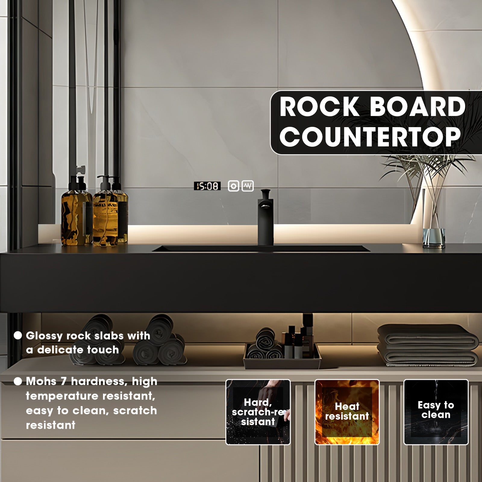 Seamless Slate Countertop with Integrated Sink: Experience seamless sophistication with our slate countertop and integrated sink. Crafted to perfection, this sleek and modern countertop seamlessly merges with the sink, creating a visually stunning focal point in your bathroom. Enjoy the natural beauty and durability of slate while effortlessly maintaining a clean and hygienic space.