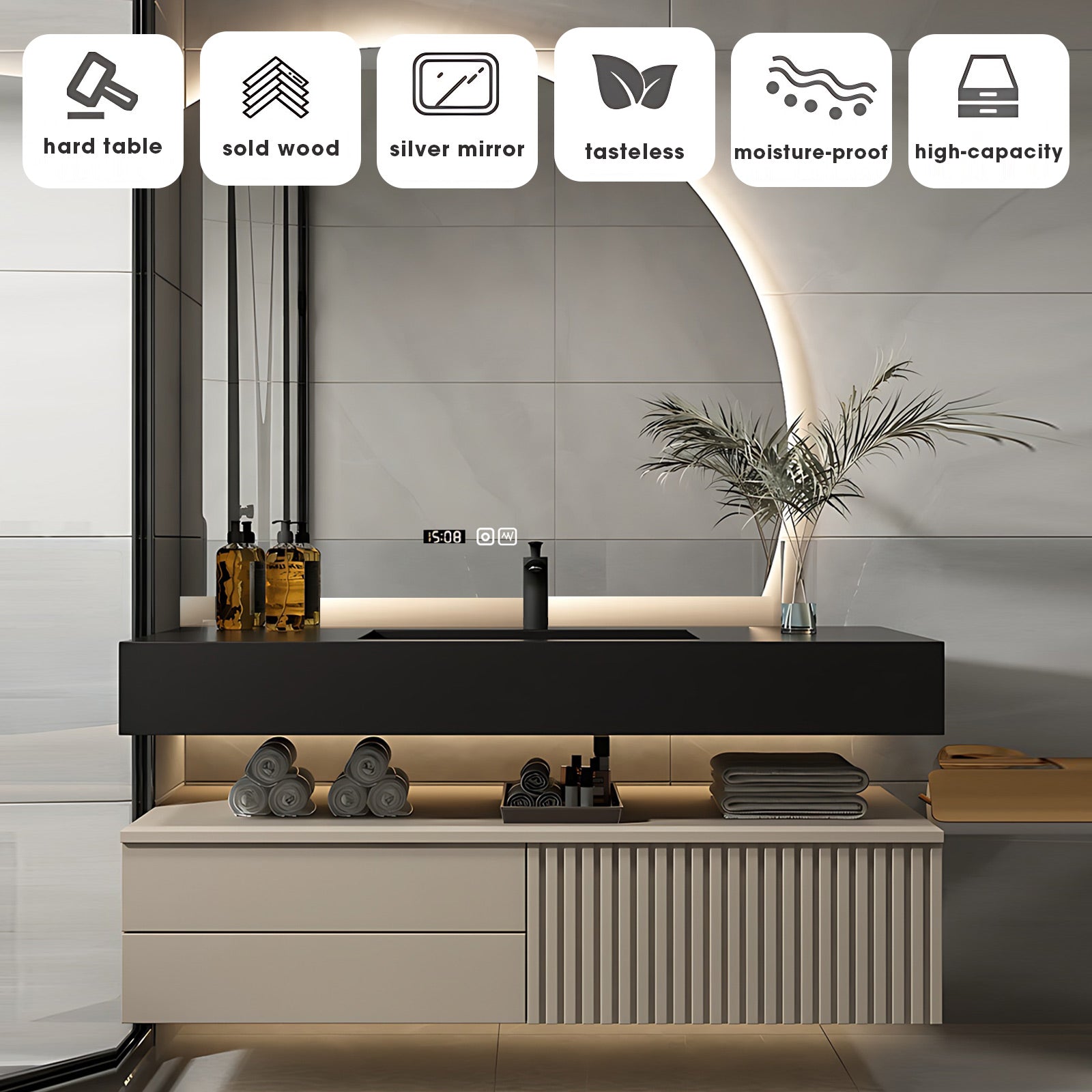 Space-Saving Wall-Mounted Design: Maximize your bathroom's potential with our wall-mounted vanity set. Say goodbye to cluttered countertops and hello to spaciousness. This sleek, space-saving design not only adds a touch of modern elegance to your space but also makes cleaning a breeze. Enjoy the convenience of ample floor space while effortlessly maintaining cleanliness and organization.