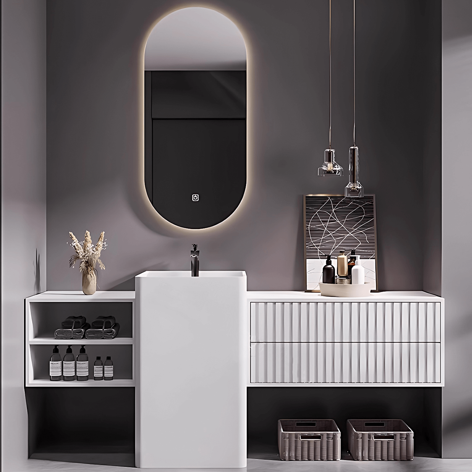Introducing our White Bathroom Vanity Set with Integrated Column Basin and Smart Oval Mirror, a harmonious fusion of functionality and style, perfect for elevating your bathroom space. Crafted with meticulous attention to detail, this vanity set offers a blend of modern innovation and timeless elegance.