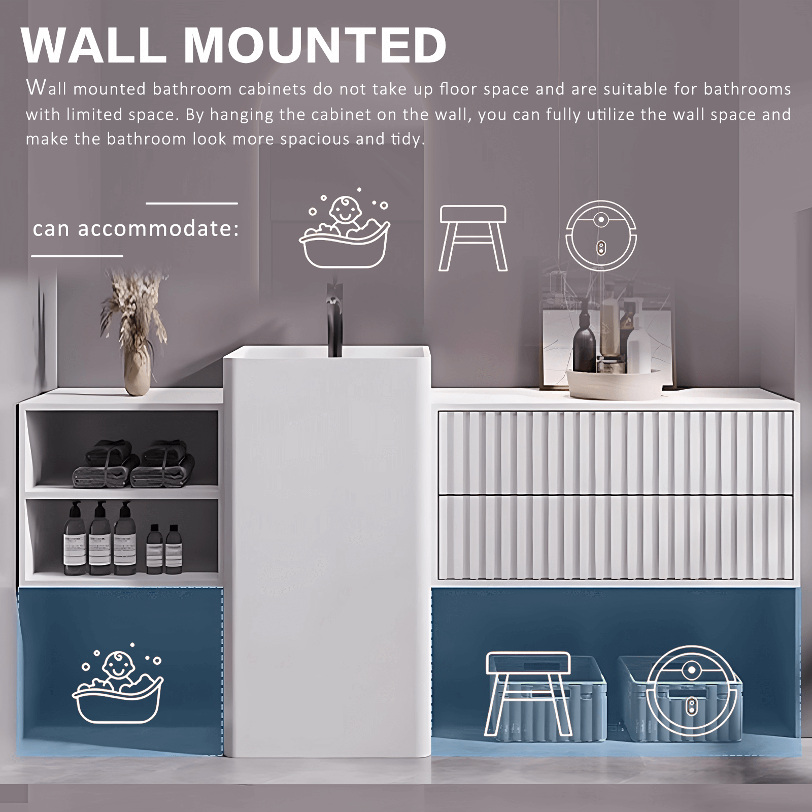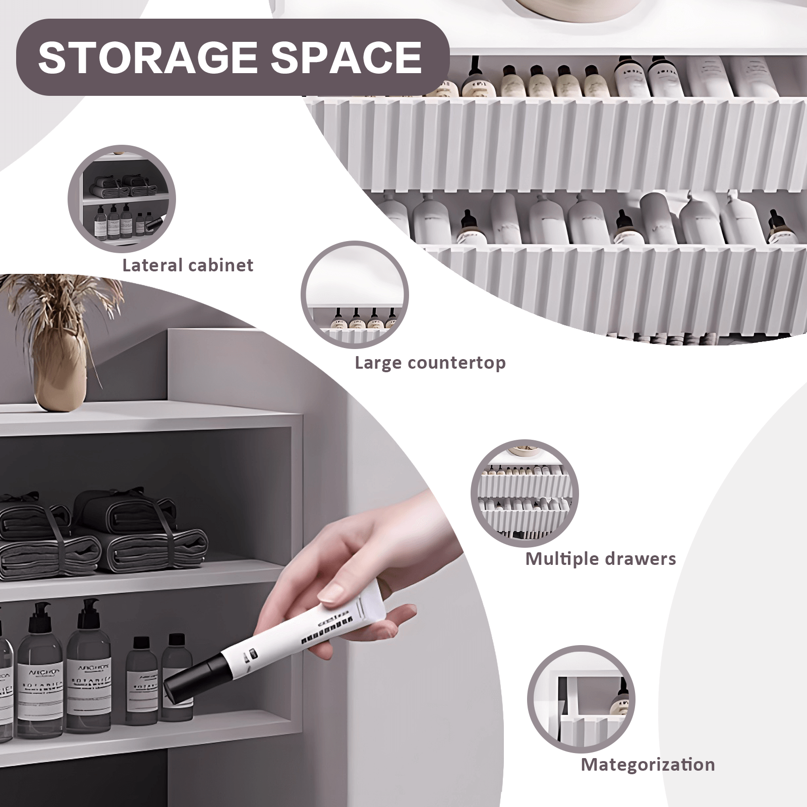 Large Storage Space: Unleash the potential of ample storage with our vanity set's extra-large storage capacity. From open storage spaces for easy access to hidden compartments for discreet organization, this bathroom cabinet offers versatile storage solutions tailored to your needs. Bid farewell to clutter and welcome a clutter-free environment with our spacious storage design.